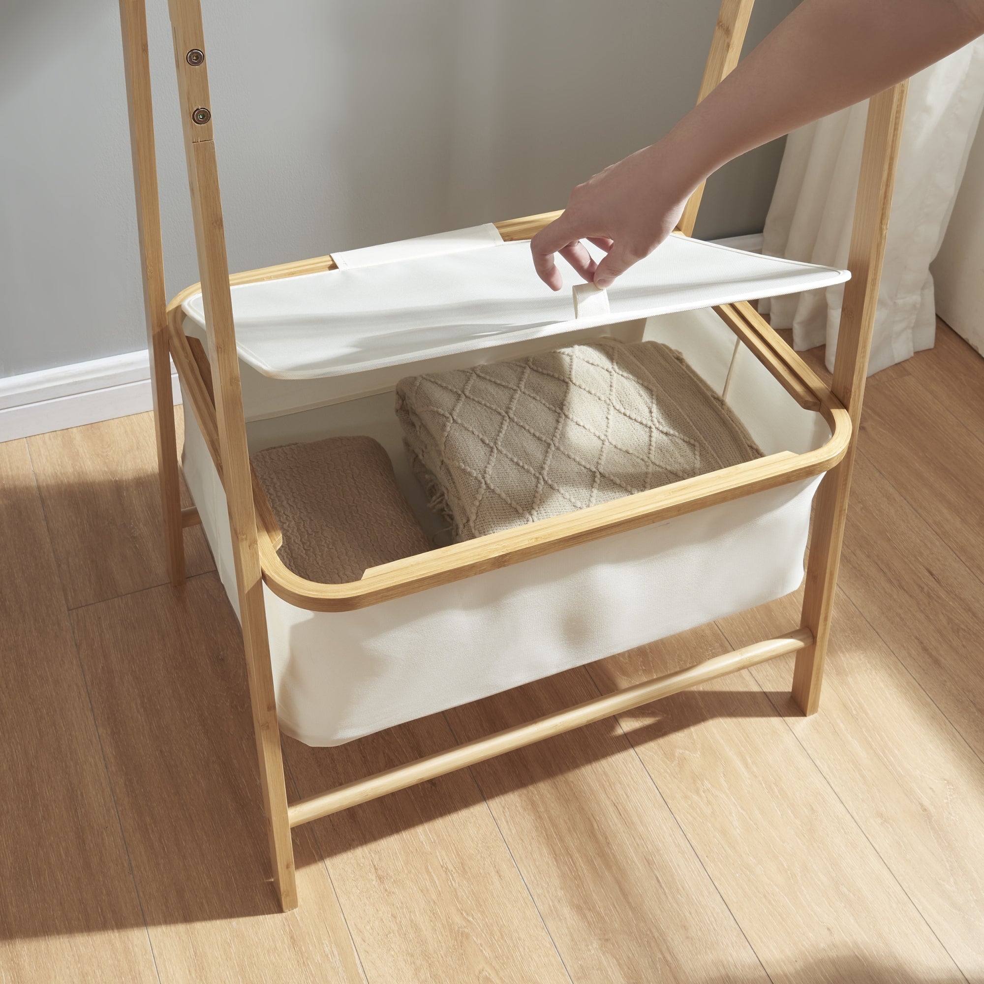 L'asta appendiabiti offre spazio sufficiente per giacche, cappotti, sciarpe e altro. La scatola contenitore inferiore fornisce ulteriore spazio di stoccaggio. Offre una soluzione ottimale per riporre coperte, asciugamani e altri accessori.
