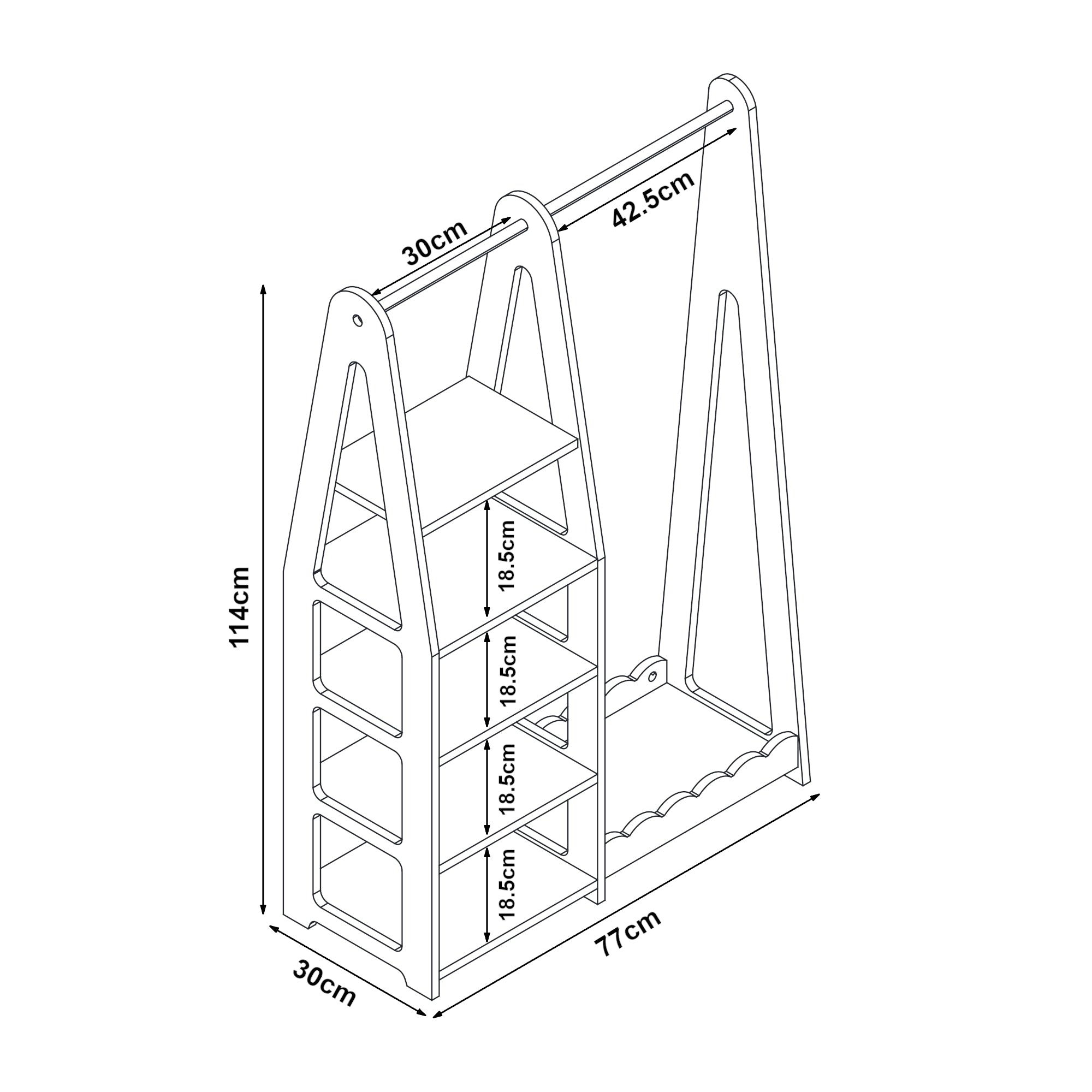 L'appendiabiti per bambini dispone di un'ampia barra per giacche, vestiti e altro, oltre a una mensola laterale con cinque ripiani. Sotto l'area appendiabiti si trova un vano aperto con un bordo ondulato, che crea spazio aggiuntivo per scarpe, cesti o scatole.