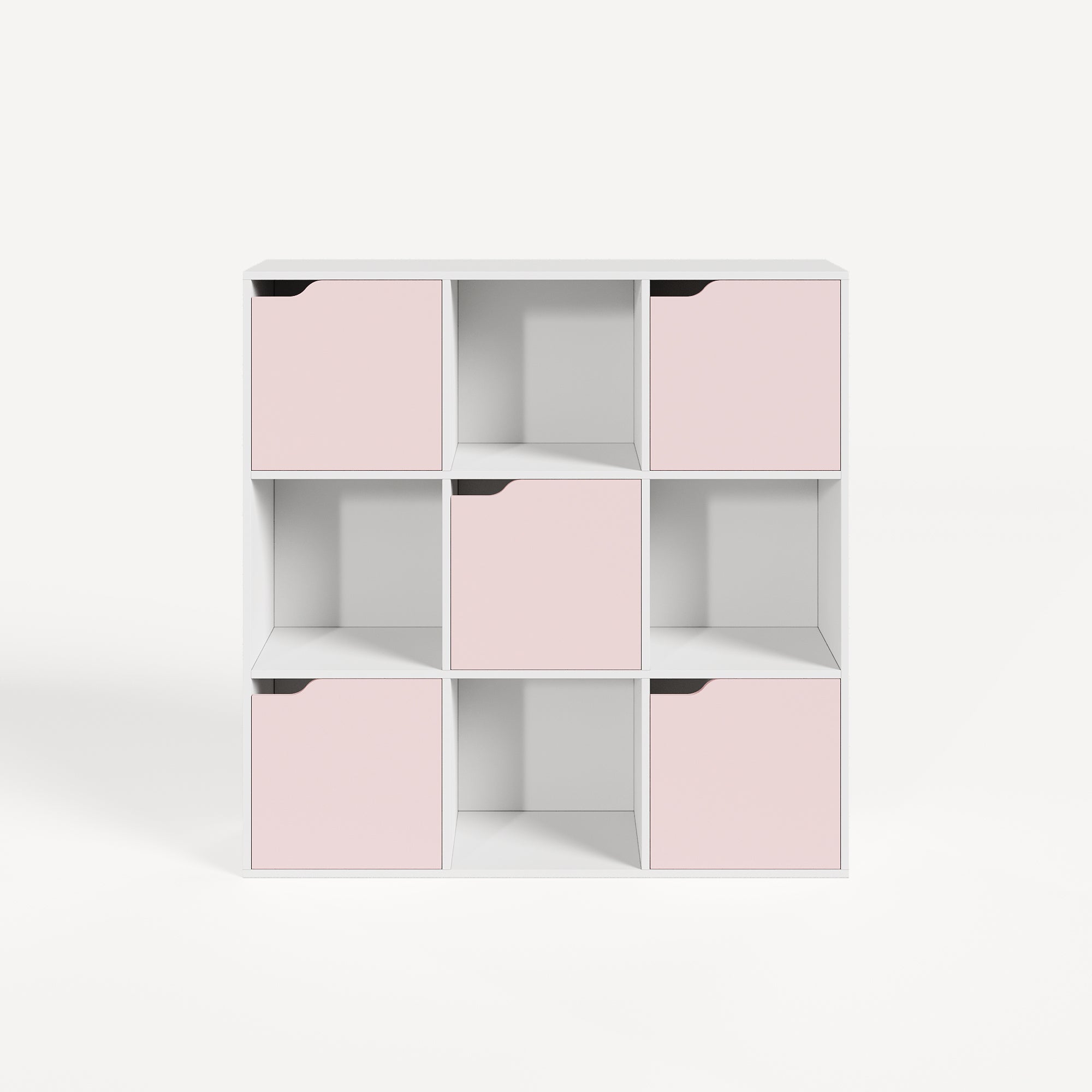 Con un totale di nove scomparti di uguale dimensione, questa libreria offre ampio spazio per riporre oggetti di vario genere. Cinque scomparti sono dotati di ante con pratica maniglia incassata, mentre quattro spazi aperti lasciano spazio a elementi decorativi.