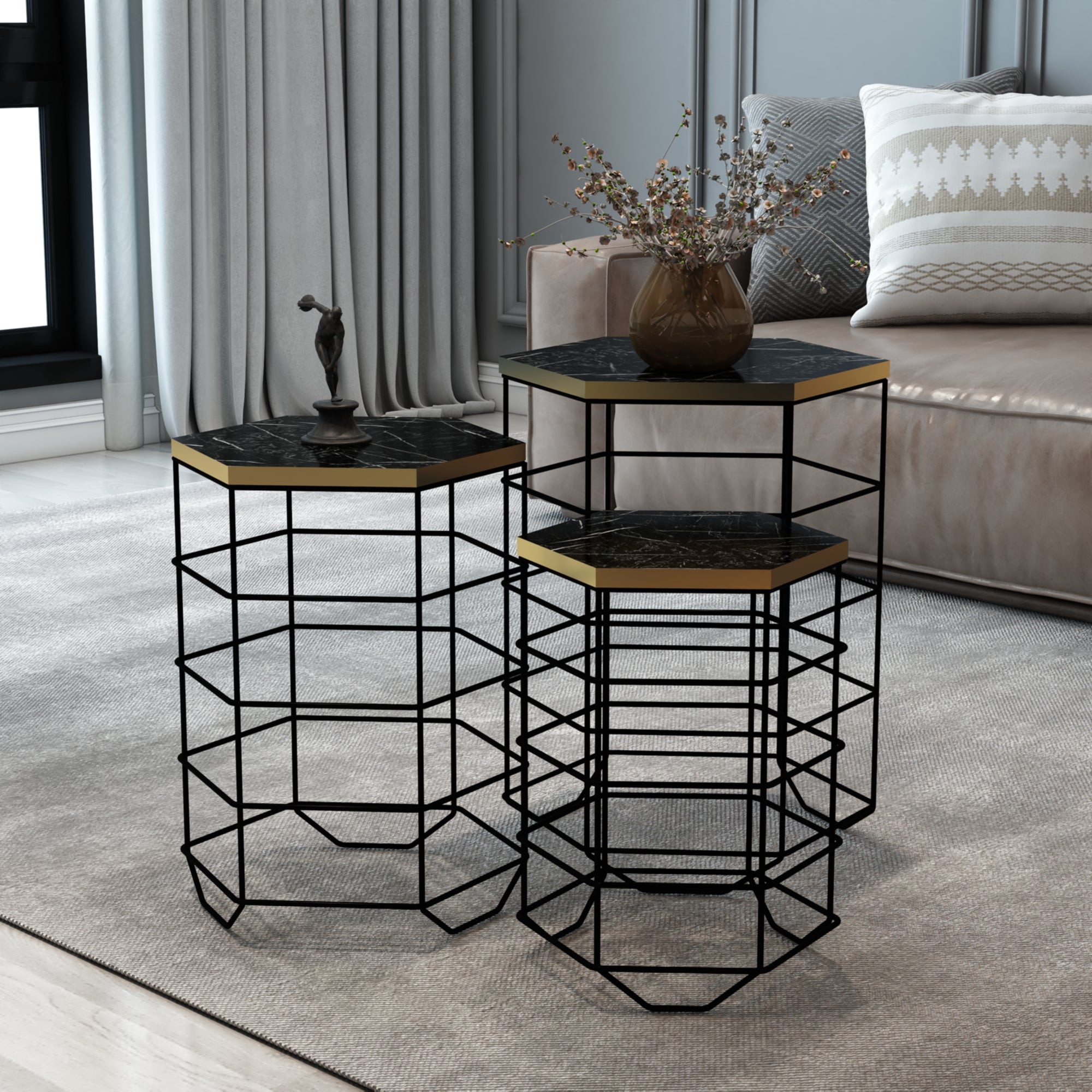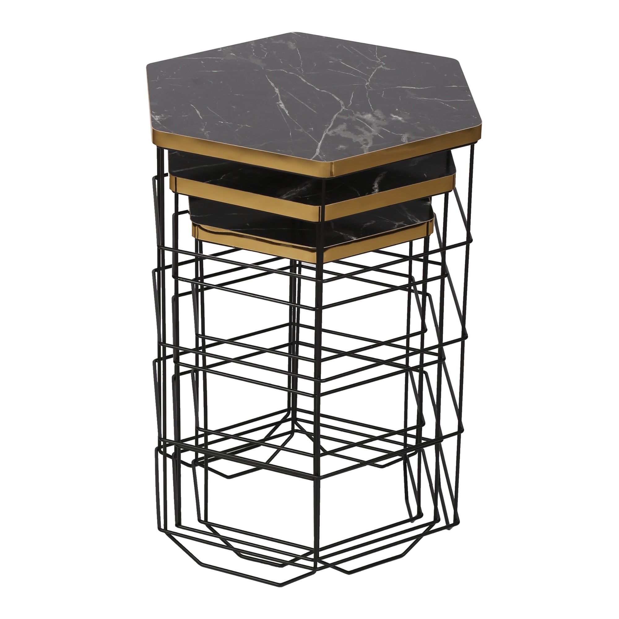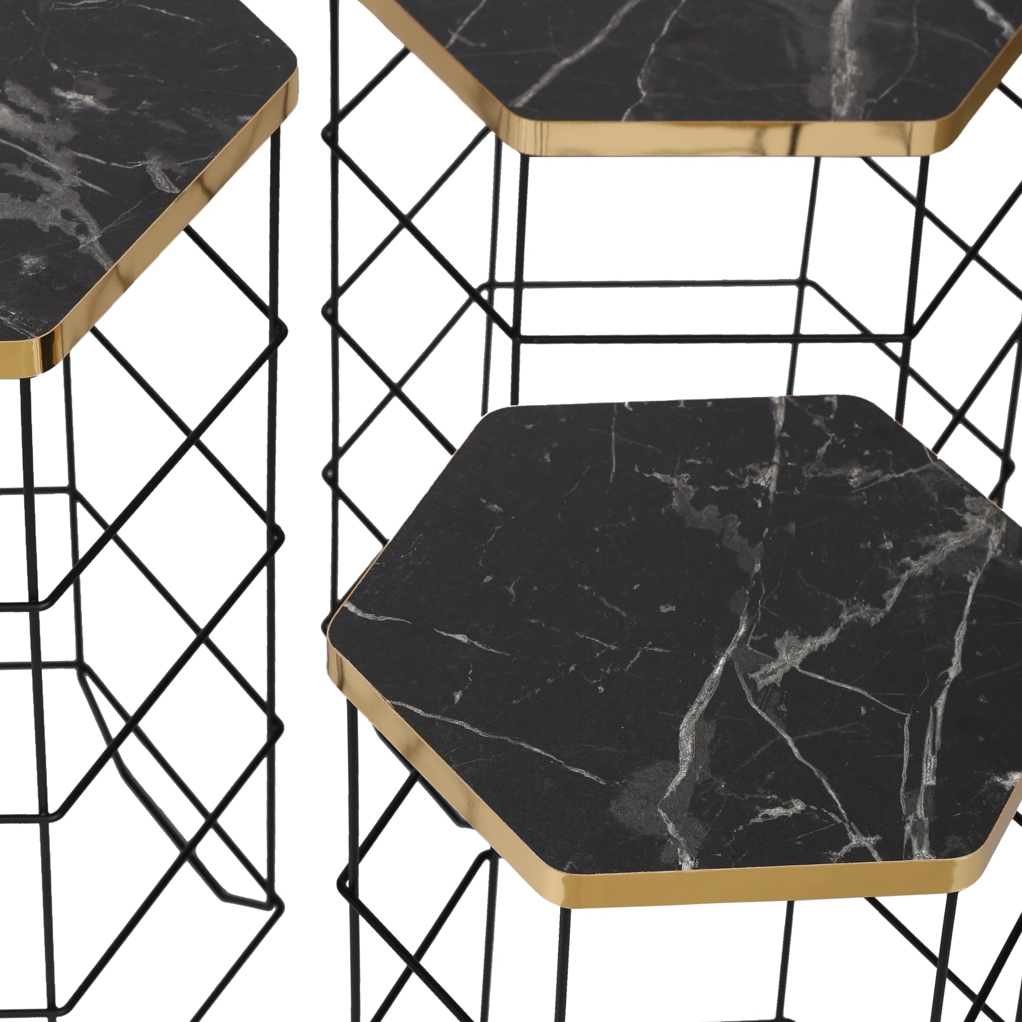 - Piani dei tavoli: effetto marmo con bordo dorato