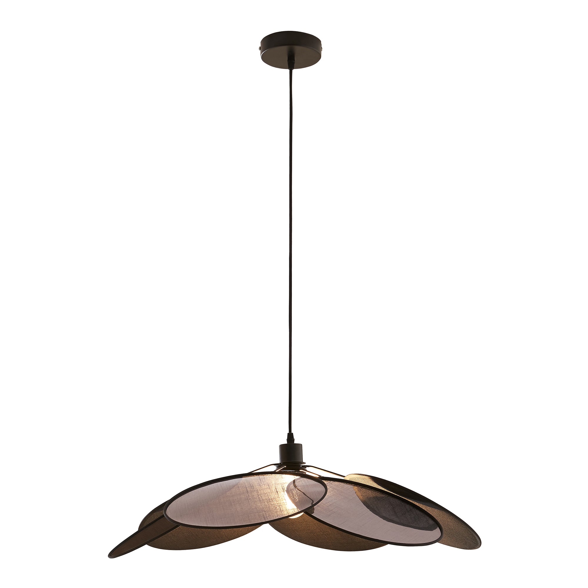 La lampada a sospensione è composta da diversi grandi paralumi in tessuto disposti a cerchio, che si sovrappongono formando un’immagine decorativa a forma di fiore. Il portalampada centrale tiene saldamente la lampadina al suo posto e garantisce un funzionamento affidabile.