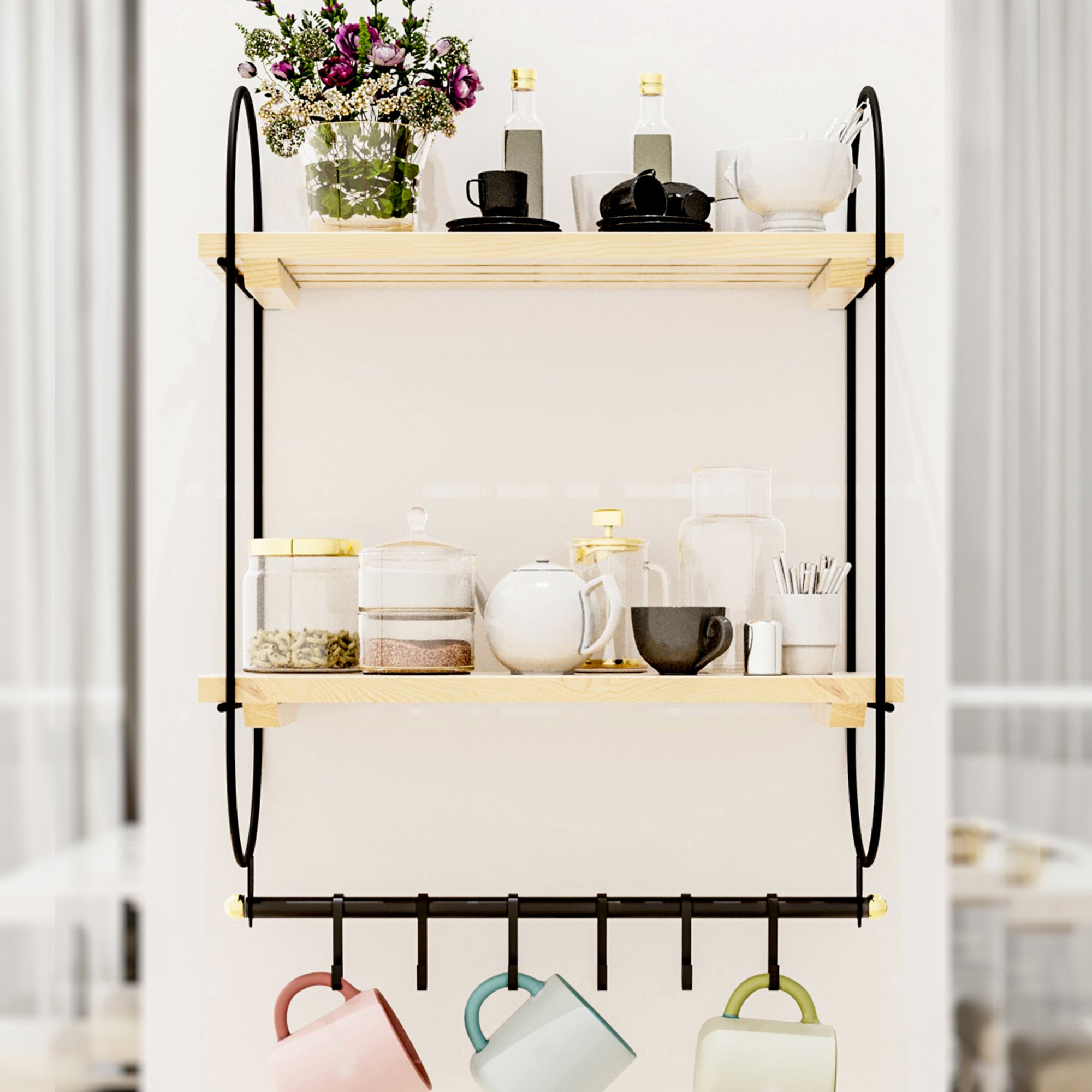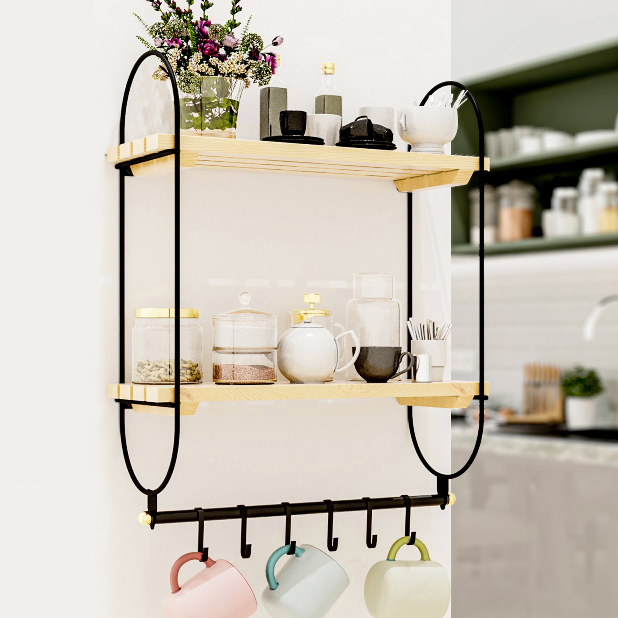Dispone di due ampi ripiani che offrono spazio sufficiente per riporre ordinatamente i vostri oggetti. Inoltre, nella parte inferiore della mensola sono presenti 6 ganci, utili per appendere presine, utensili da cucina, asciugamani o chiavi nell’ingresso.