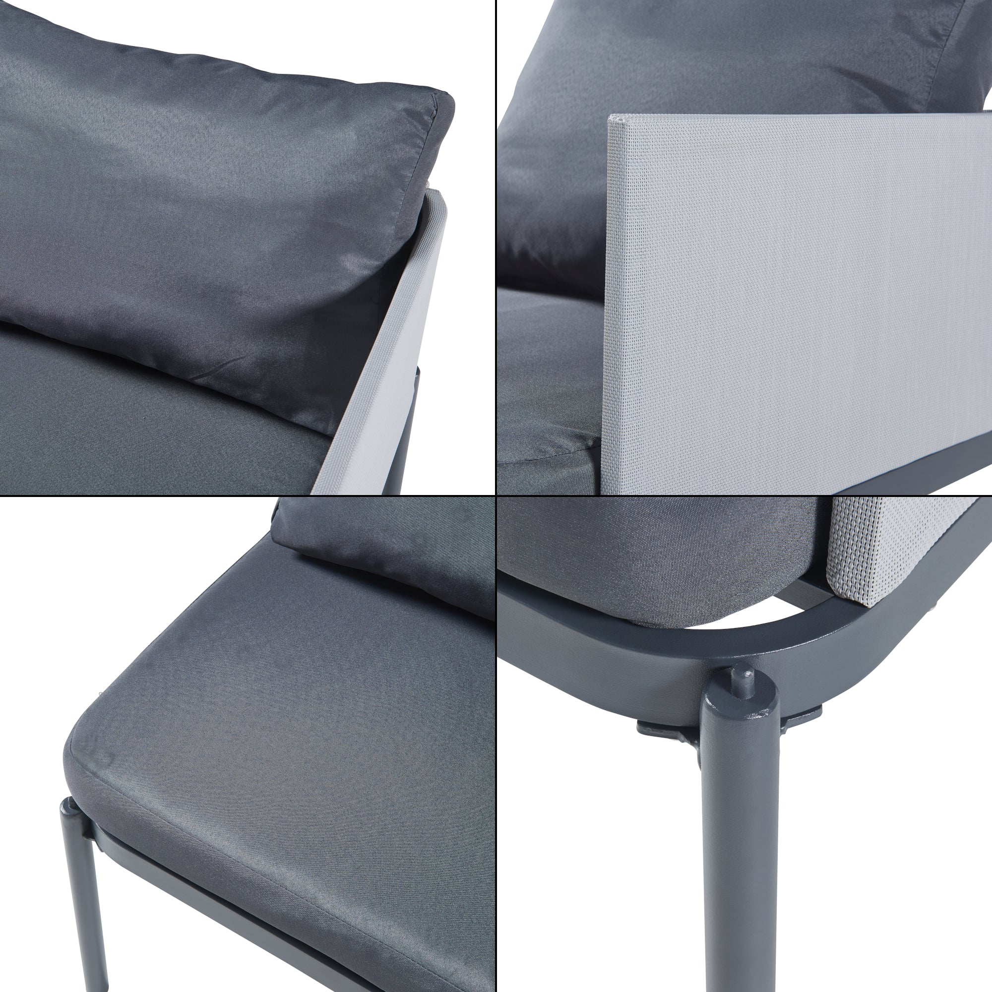 Le sedie sono dotate di comodi cuscini imbottiti che garantiscono un comfort aggiuntivo. Il tavolo quadrato è perfetto per posizionare bevande, snack e altri oggetti. Grazie ai braccioli su un solo lato, le sedie possono essere facilmente accostate per creare una superficie di seduta più ampia o un comodo divano.