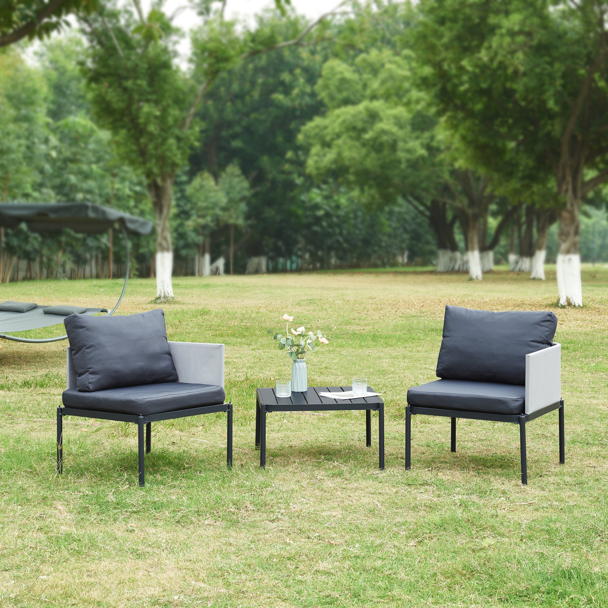 - Set di mobili da giardino composto da tre pezzi: un tavolo e due sedie