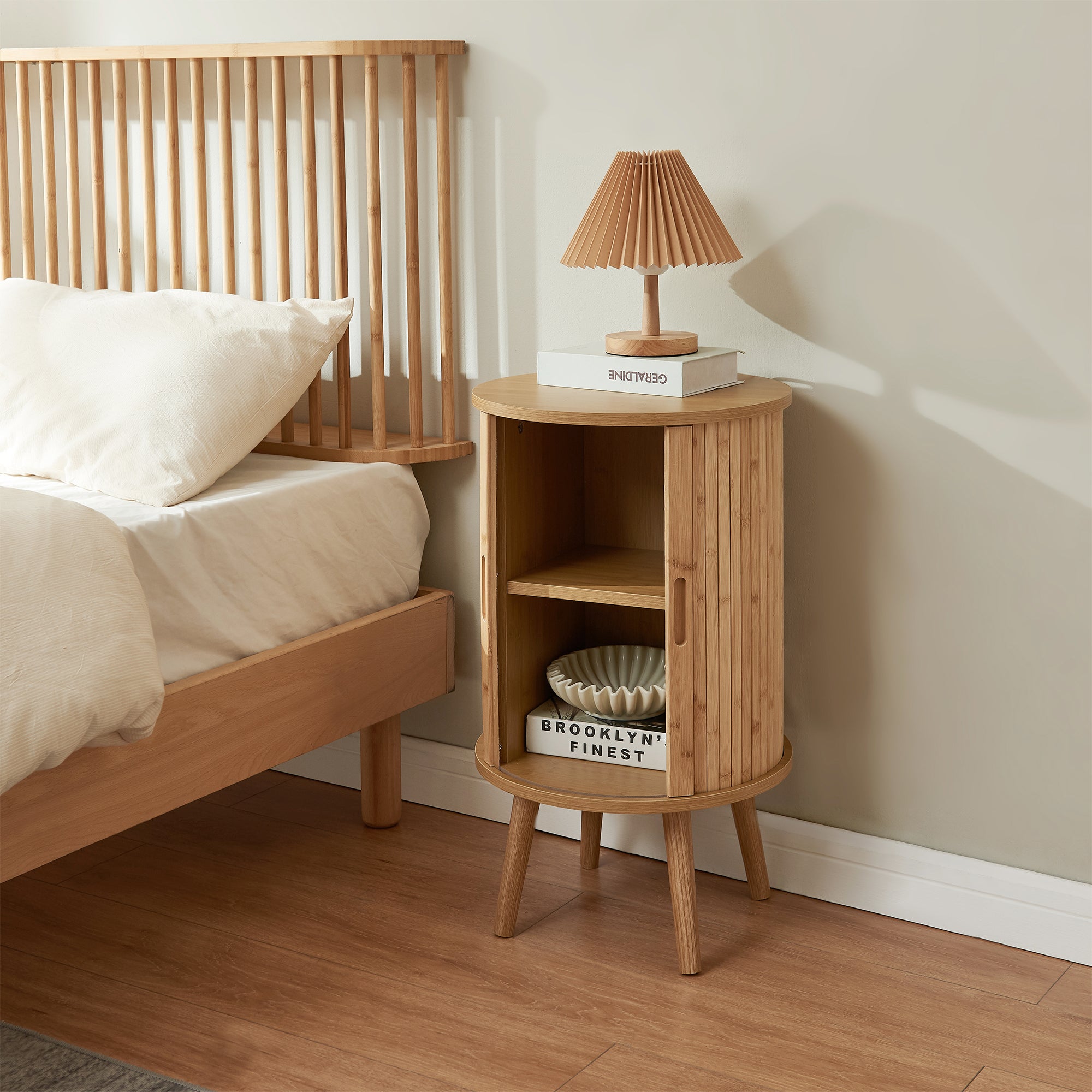 Le dimensioni compatte lo rendono perfetto accanto al letto, dove offre un pratico piano d’appoggio per una lampada, un libro o gli oggetti essenziali della quotidianità. Allo stesso tempo, la sua struttura verticale consente di ottimizzare lo spazio senza rinunciare alla capienza interna.