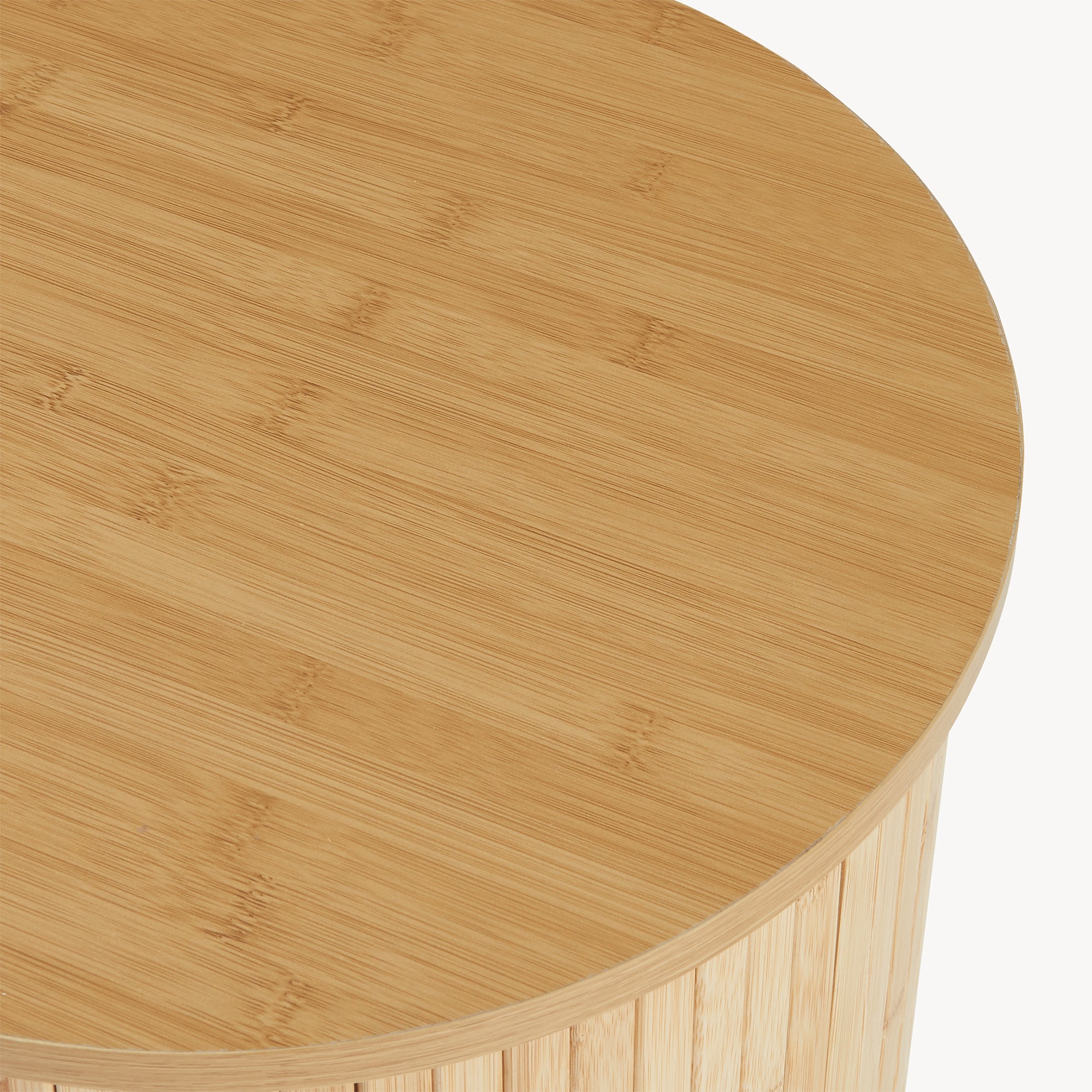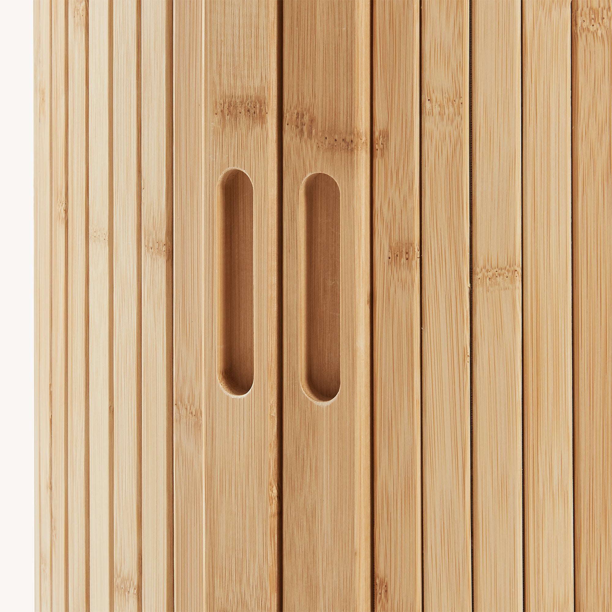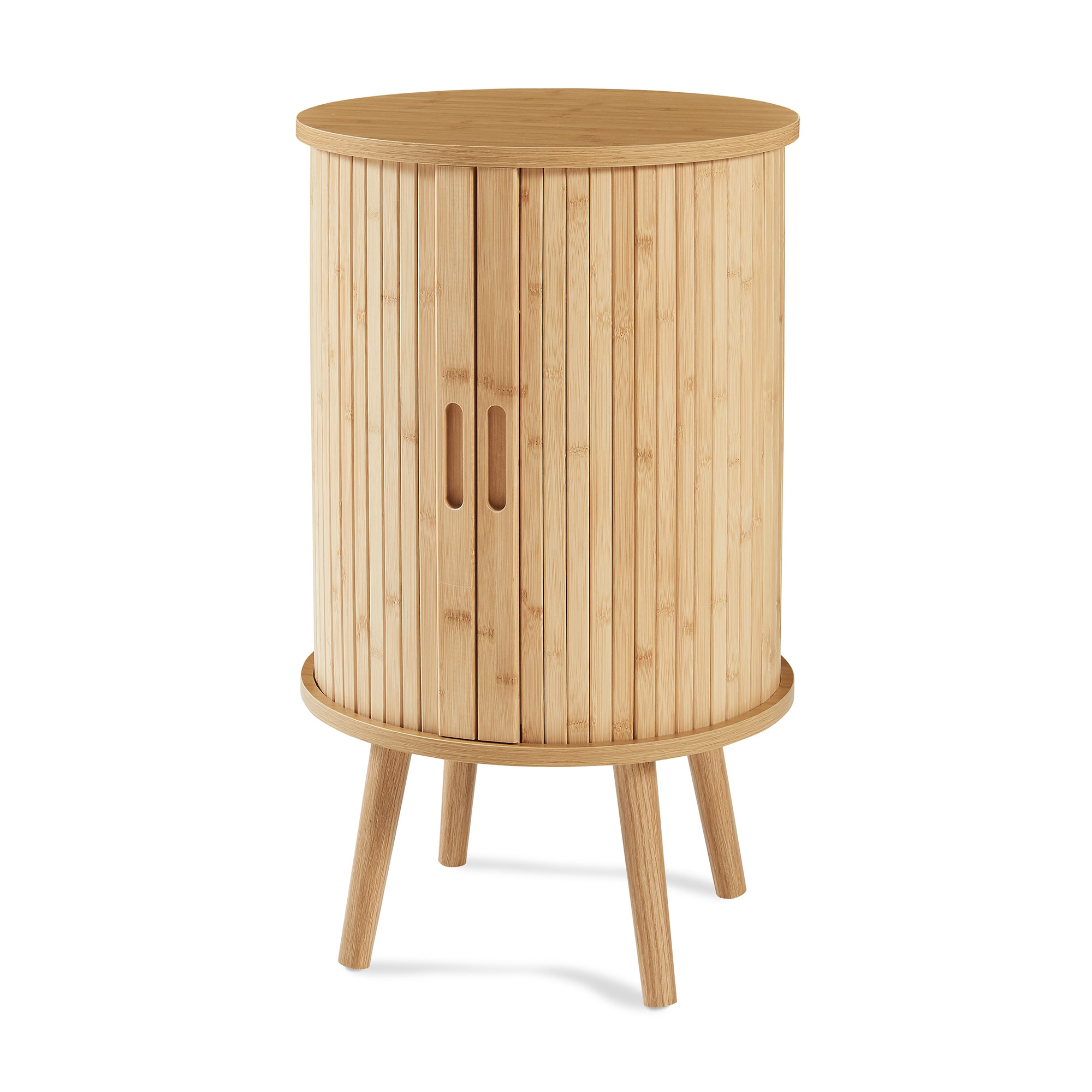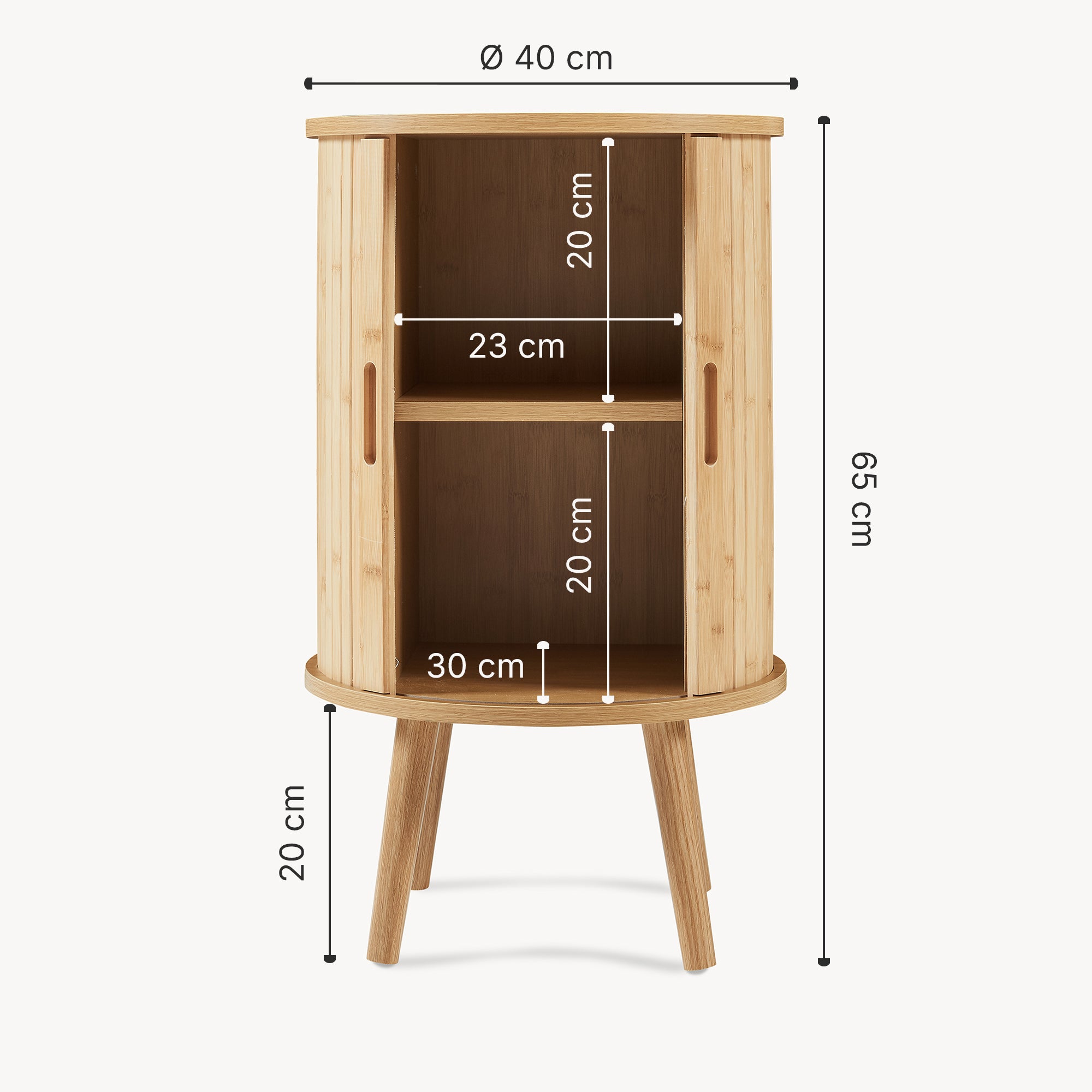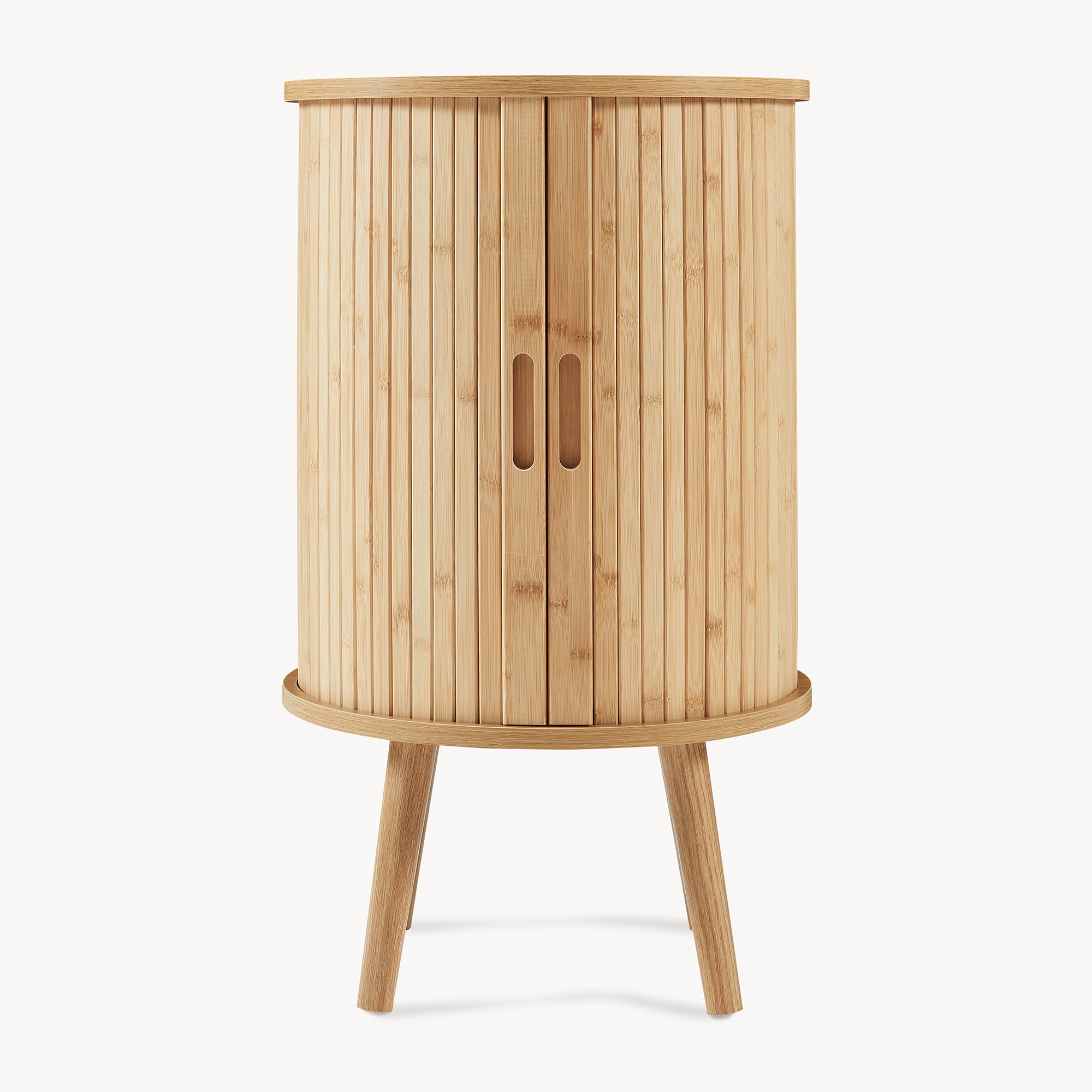 Realizzato con materiali selezionati, presenta piano e scomparti interni in MDF, che garantiscono stabilità e resistenza nel tempo. Le ante scorrevoli in doghe di bambù valorizzano la forma curva del mobile, creando un elegante gioco di linee verticali e aggiungendo una nota calda e naturale. I piedini in legno massiccio, solidi e leggermente inclinati, slanciano ulteriormente la struttura e assicurano un appoggio stabile.