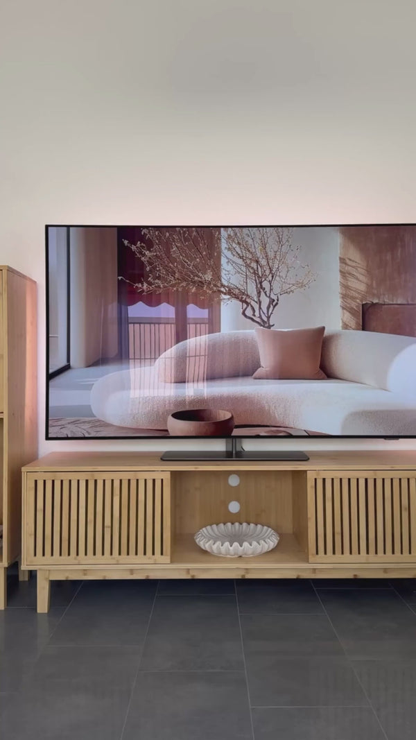 Il mobile TV color naturale è un complemento d'arredo che combina eleganza e praticità, perfetto per valorizzare qualsiasi ambiente. Realizzato interamente in bambù, questo mobile si distingue per il suo design caldo e accogliente, con un'estetica che si adatta perfettamente a interni in stile scandinavo, boho chic o contemporaneo. Le ante scorrevoli a griglia conferiscono al mobile un tocco unico, lasciando intravedere leggermente il contenuto.