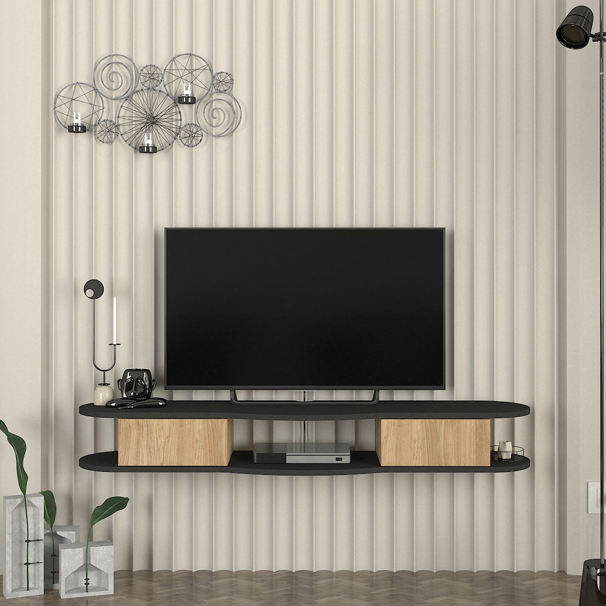 La spaziosa superficie superiore offre ampio spazio per il televisore. Sotto si trova un vano aperto per dispositivi multimediali come console di gioco, lettore DVD, decoder o box streaming. Ai lati, a sinistra e a destra, ci sono due sportelli a ribalta per riporre accessori, DVD o altri piccoli oggetti.