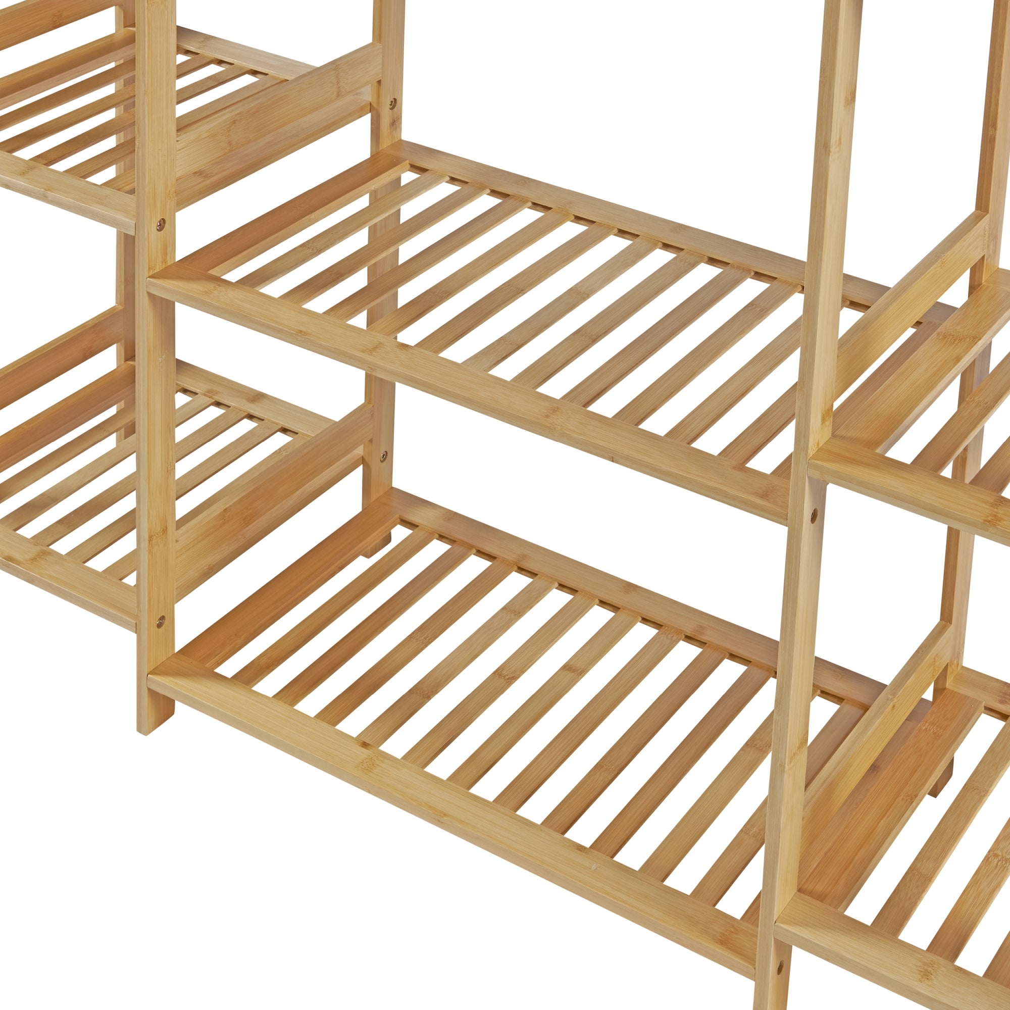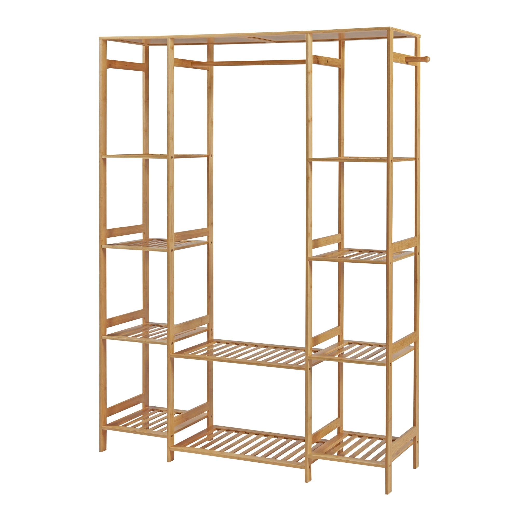 Il pratico e elegante appendiabiti è facile e veloce da montare. Dispone di un'asta appendiabiti, due ampi ripiani centrali e una mensola su ciascun lato con quattro scomparti aperti ciascuno.
