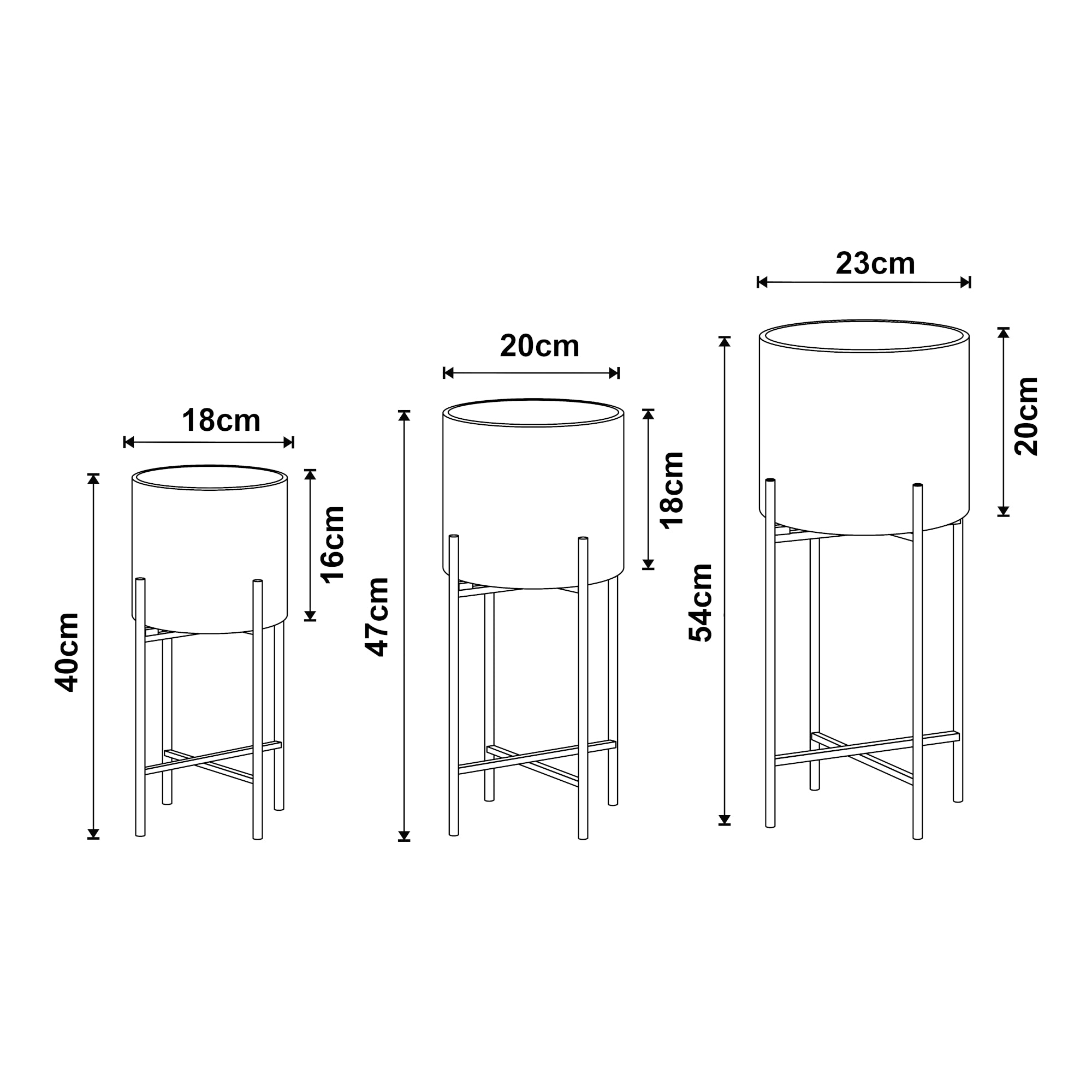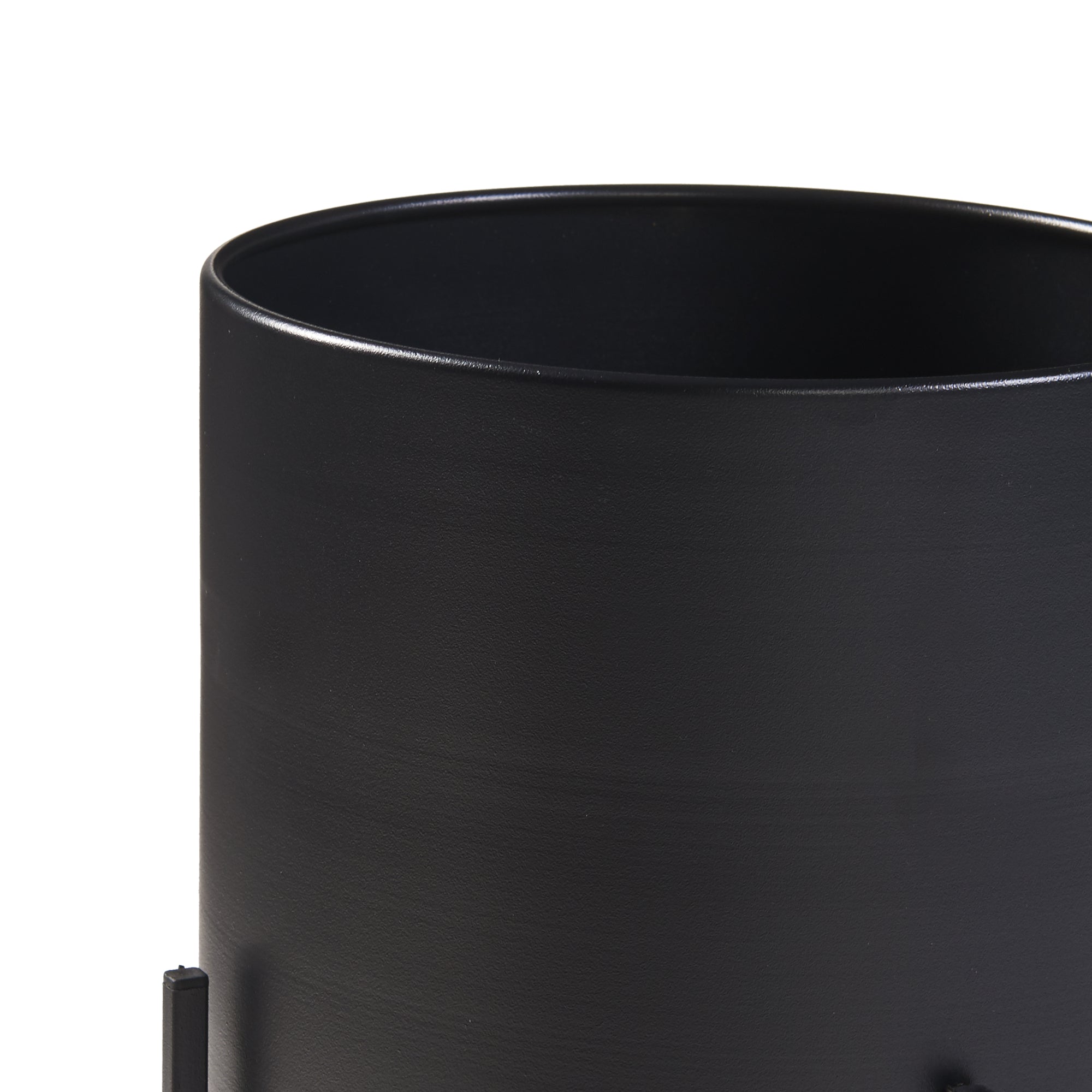 Il punto di incrocio superiore svolge la funzione di sostegno per la custodia del vaso. Quest'ultima, dalla forma cilindrica, offre un alloggio sicuro e stabile per il vaso, aggiungendo un tocco contemporaneo all'allestimento complessivo. I portapiante sono interamente costruiti in metallo di colore nero, conferendo modernità e raffinatezza. Questa scelta aggiunge anche durabilità e resistenza nel tempo.