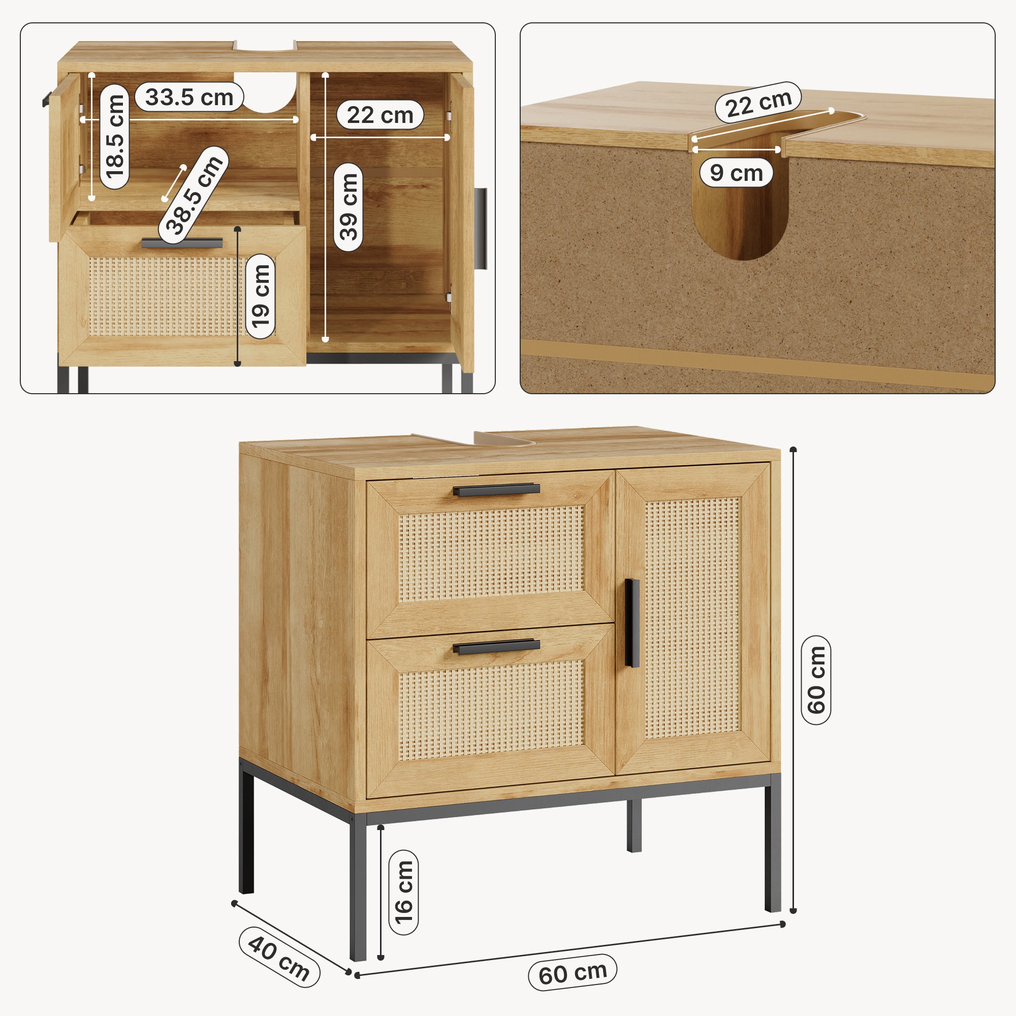 Questo mobile unisce funzionalità e stile, offrendo una soluzione pratica per sfruttare al meglio lo spazio sotto il lavabo e mantenere il bagno sempre ordinato. Il design, valorizzato dai frontali con elegante effetto rattan, dona leggerezza visiva al mobile e si integra facilmente in diversi ambienti.