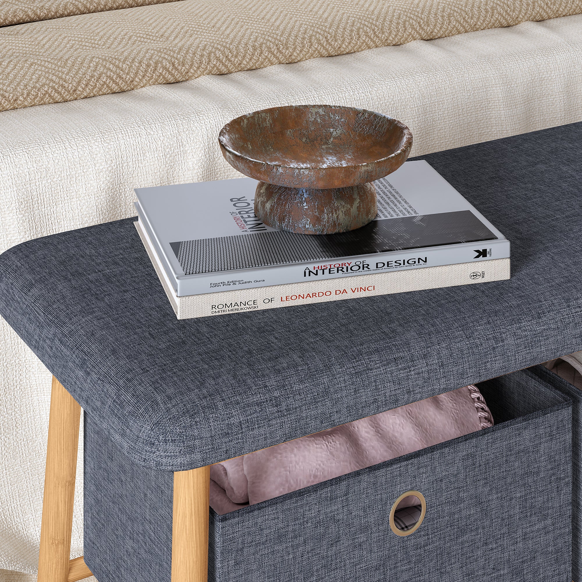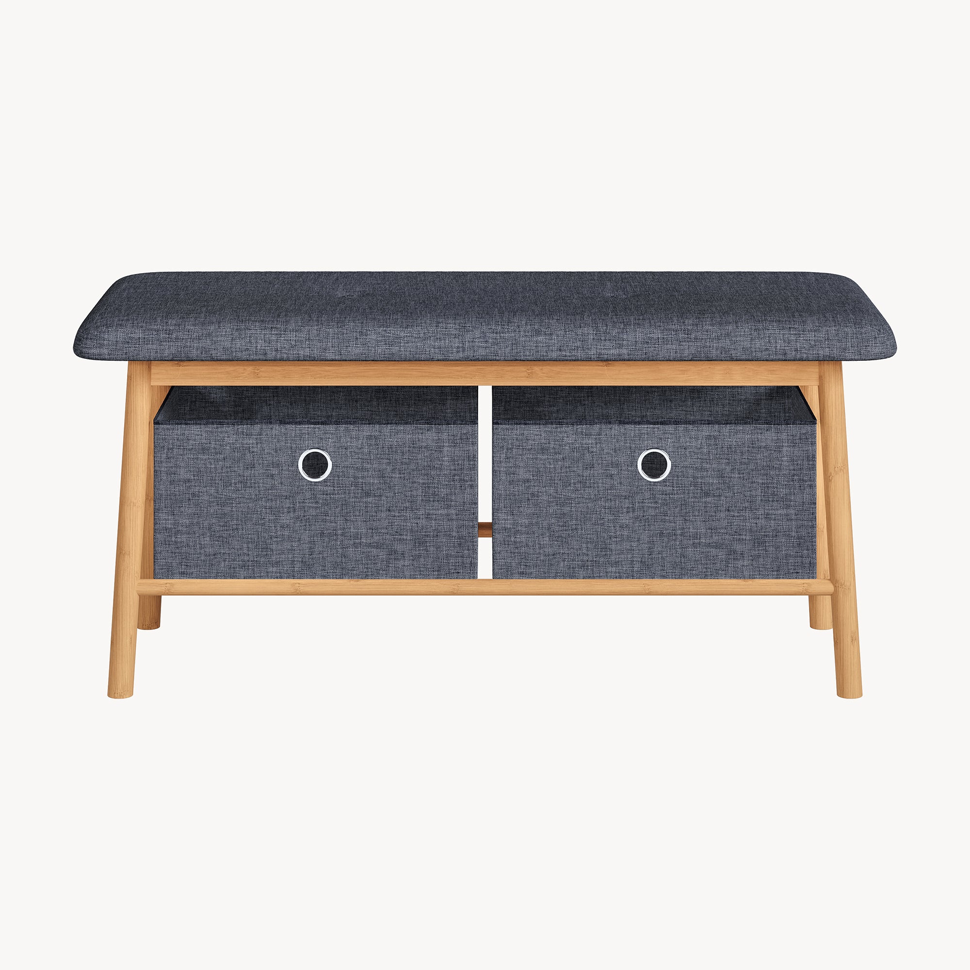 La seduta imbottita rende la panca particolarmente confortevole e pratica durante la routine quotidiana, offrendo un appoggio comodo quando si indossano o si tolgono le scarpe. Al di sotto della seduta si trovano due spaziose scatole estraibili rivestite in poliestere, progettate per riporre in modo discreto e organizzato oggetti di uso frequente come cappelli, scarpe, borse o piccoli accessori.