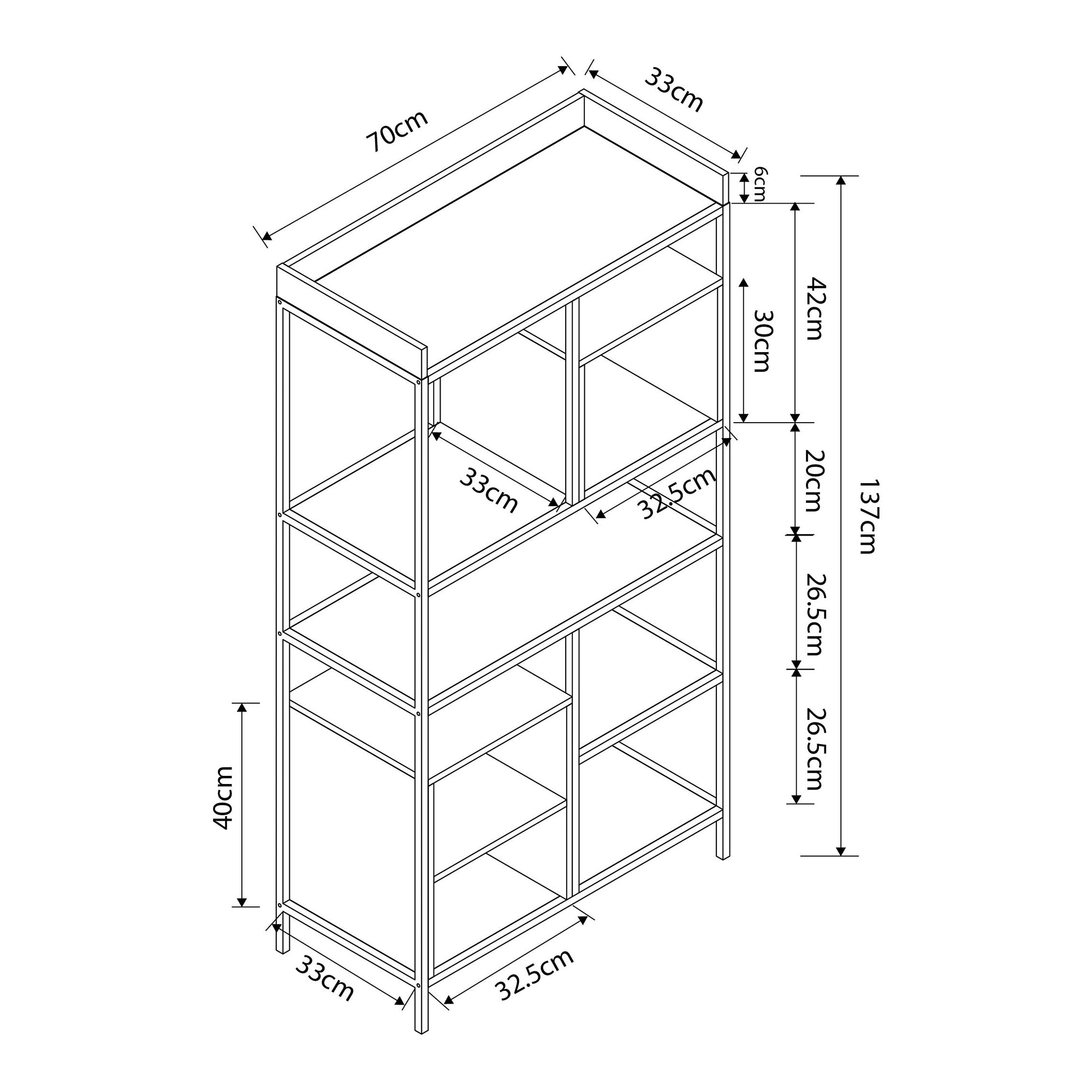 Ideale per il soggiorno, lo studio o anche per l’ufficio, si presta perfettamente a ospitare libri, piante, oggetti decorativi o elementi di uso quotidiano. La parte superiore è rifinita da un bordo di 6 cm che incornicia elegantemente l’intera struttura e può essere utilizzata anch'essa come piano d'appoggio. Grazie al design aperto, ogni elemento è sempre visibile e facilmente accessibile, contribuendo a mantenere l’ambiente ordinato e ben organizzato.