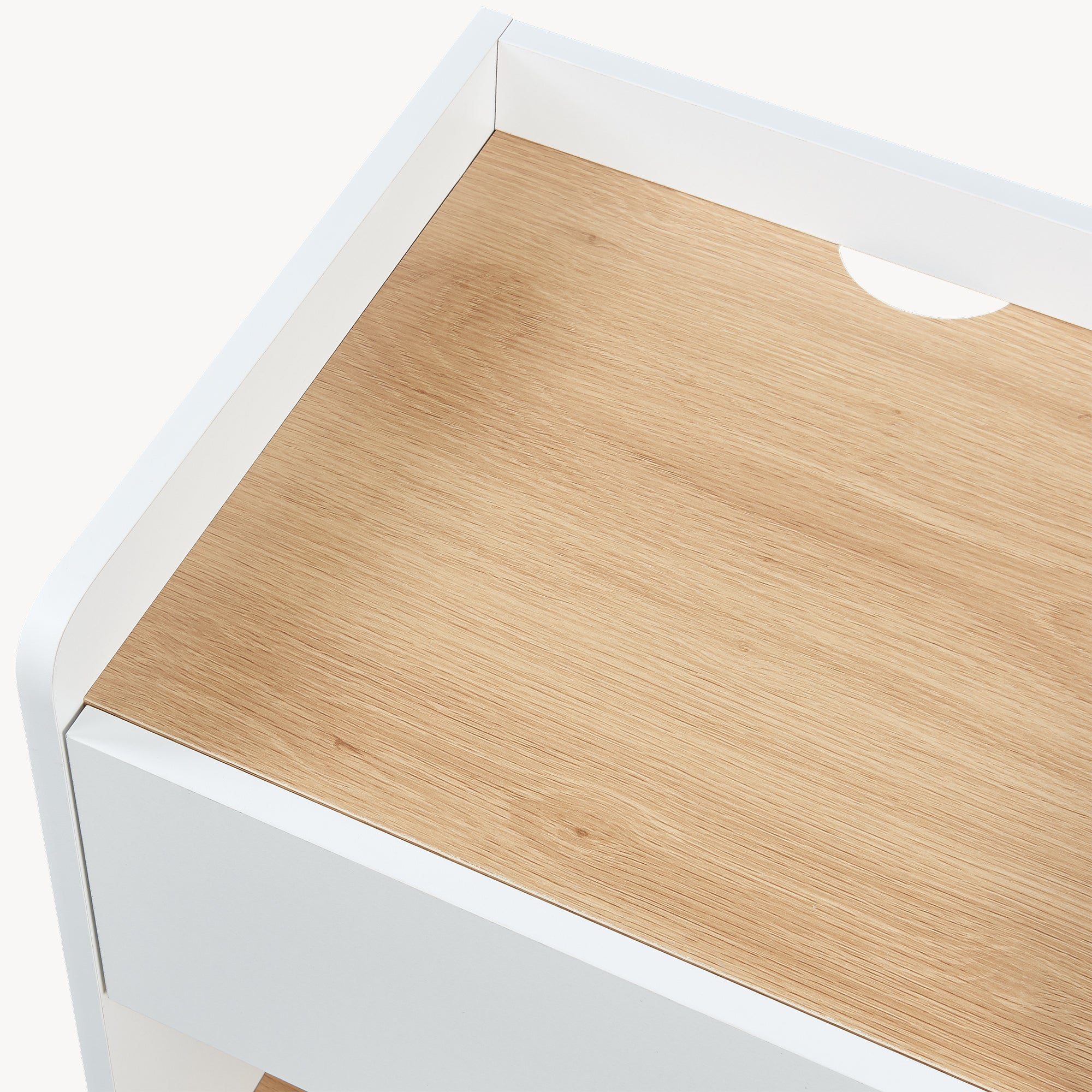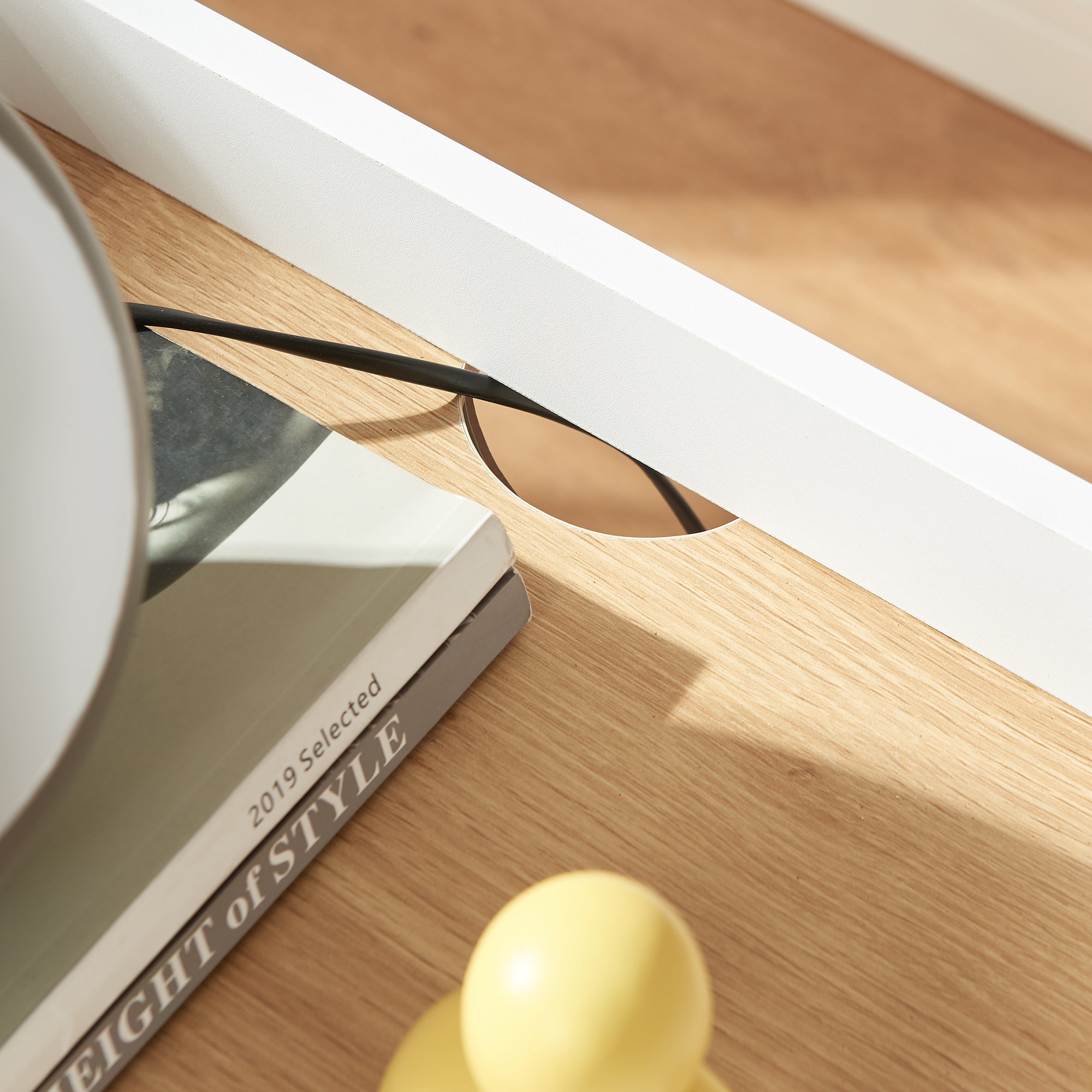 Grazie alle dimensioni compatte, il comodino si adatta perfettamente accanto al letto. Il piano offre spazio sufficiente per smartphone, occhiali, libro o una tazza di tè ed è bordato lateralmente e posteriormente, così gli oggetti appoggiati rimangono saldamente al loro posto, mentre un passacavi integrato garantisce un ordinato instradamento dei cavi di caricabatterie o lampade da tavolo.