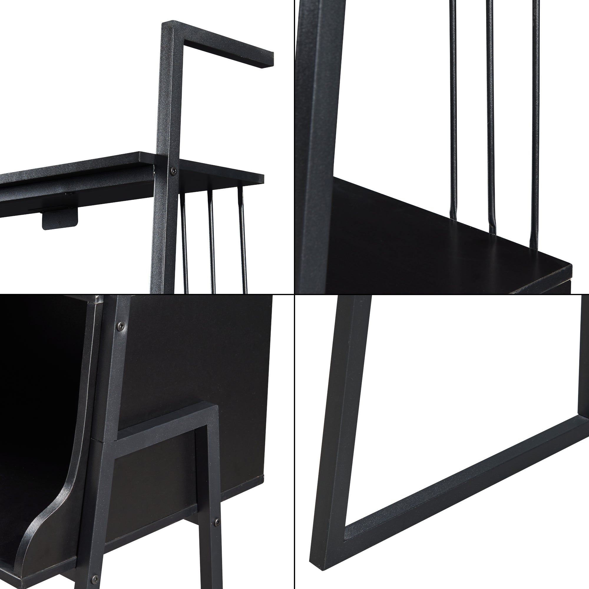 La struttura portante è costituita da un robusto telaio in metallo, che assicura la stabilità del mobile. Il nucleo scrivania e i ripiani superiori, che offrono ampio spazio per libri, decorazioni o materiali di lavoro, sono realizzati in truciolare rifinito in nero, che la rende adatta a diverse tipologie di arredamento.