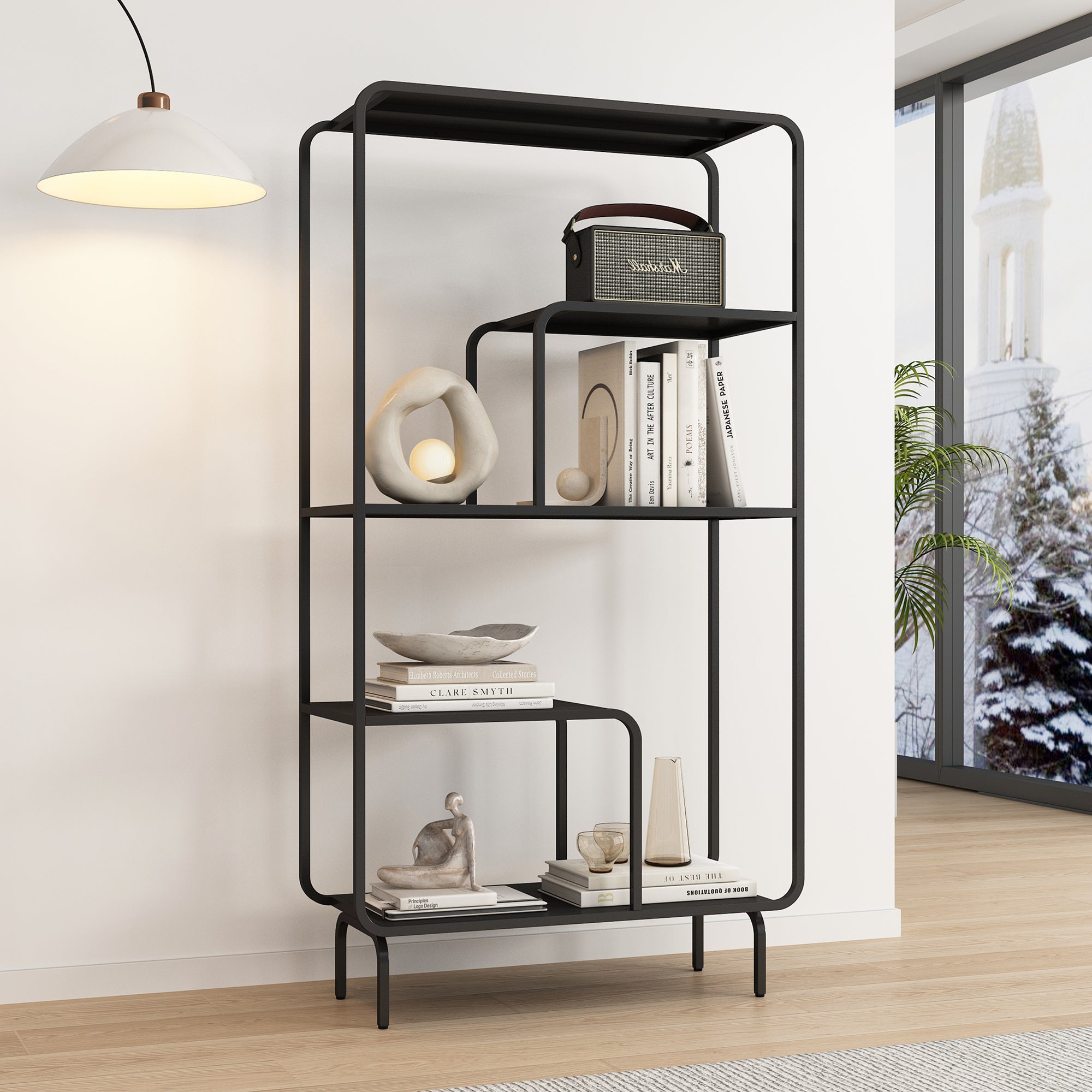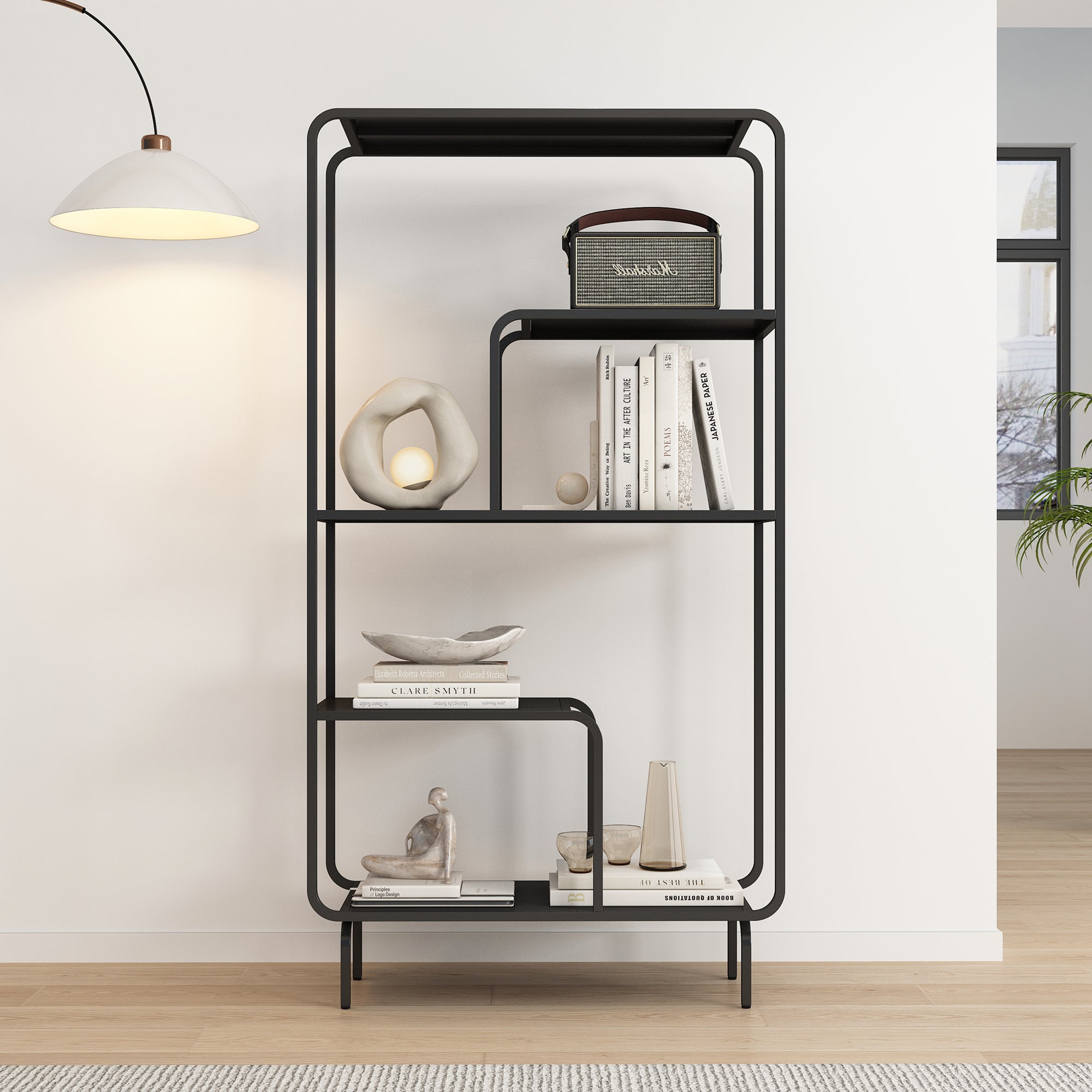 Die vier offenen Regalfächer des Standregals bieten ausreichend Platz zum Verstauen von Büchern, Pflanzen und anderen persönlichen Schätzen. Sie teilen sich in zwei große L-förmige und zwei kleine rechteckige Fächer auf. Durch diese offene Gestaltung sind Ihre Lieblingsgegenstände stets griffbereit und gleichzeitig ansprechend präsentiert.