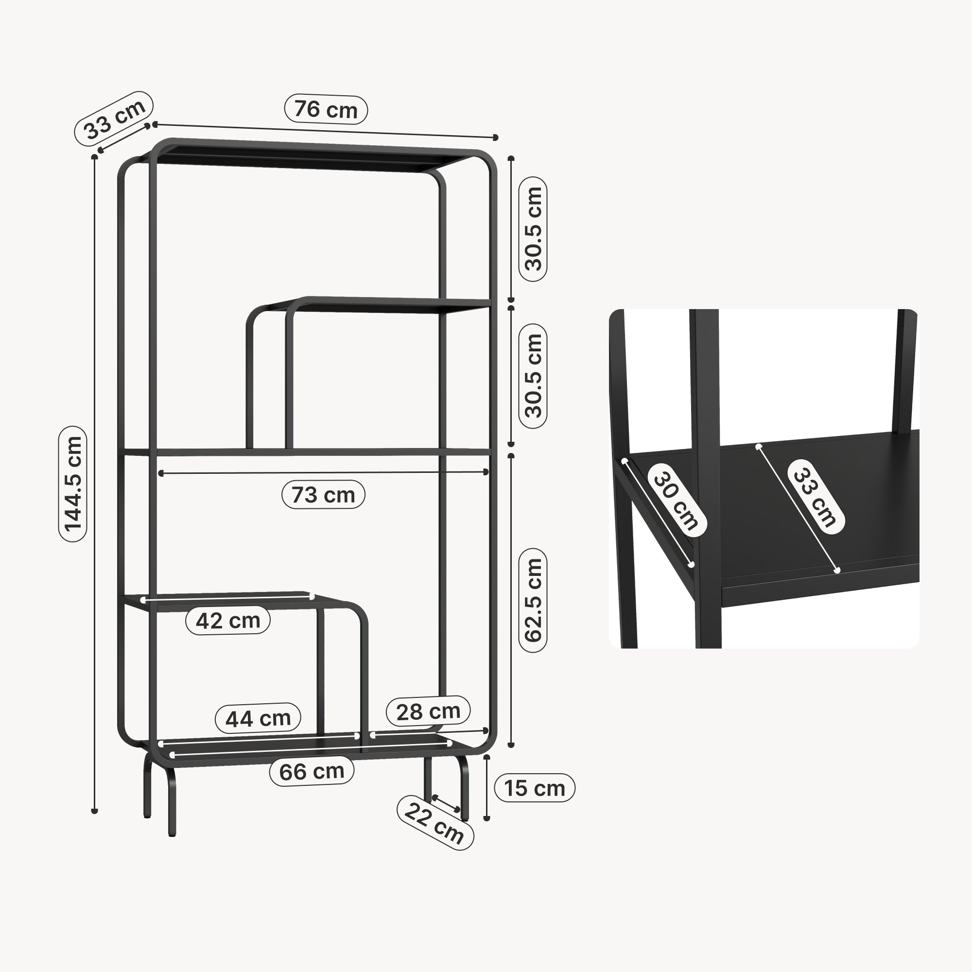 - Gesamt (HxBxT): 144,5 x 76 x 33 cm