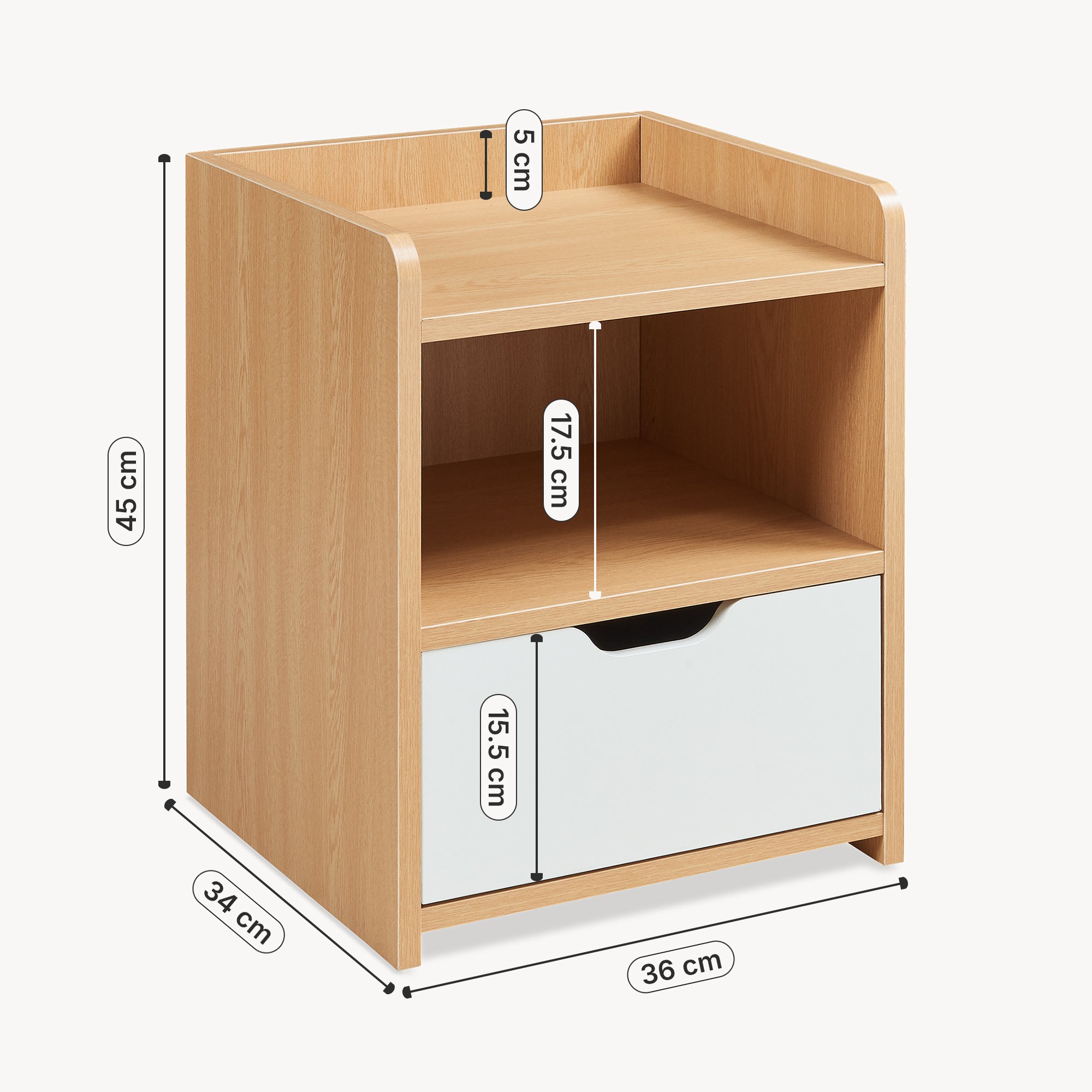 Grazie alle sue dimensioni compatte, il comodino si adatta perfettamente accanto al letto. Il piano robusto offre spazio sufficiente per una lampada, il vostro smartphone, una tazza di tè o altri oggetti che desiderate avere a portata di mano. Il bordo rialzato ai lati e sul retro impedisce che gli oggetti cadano accidentalmente.