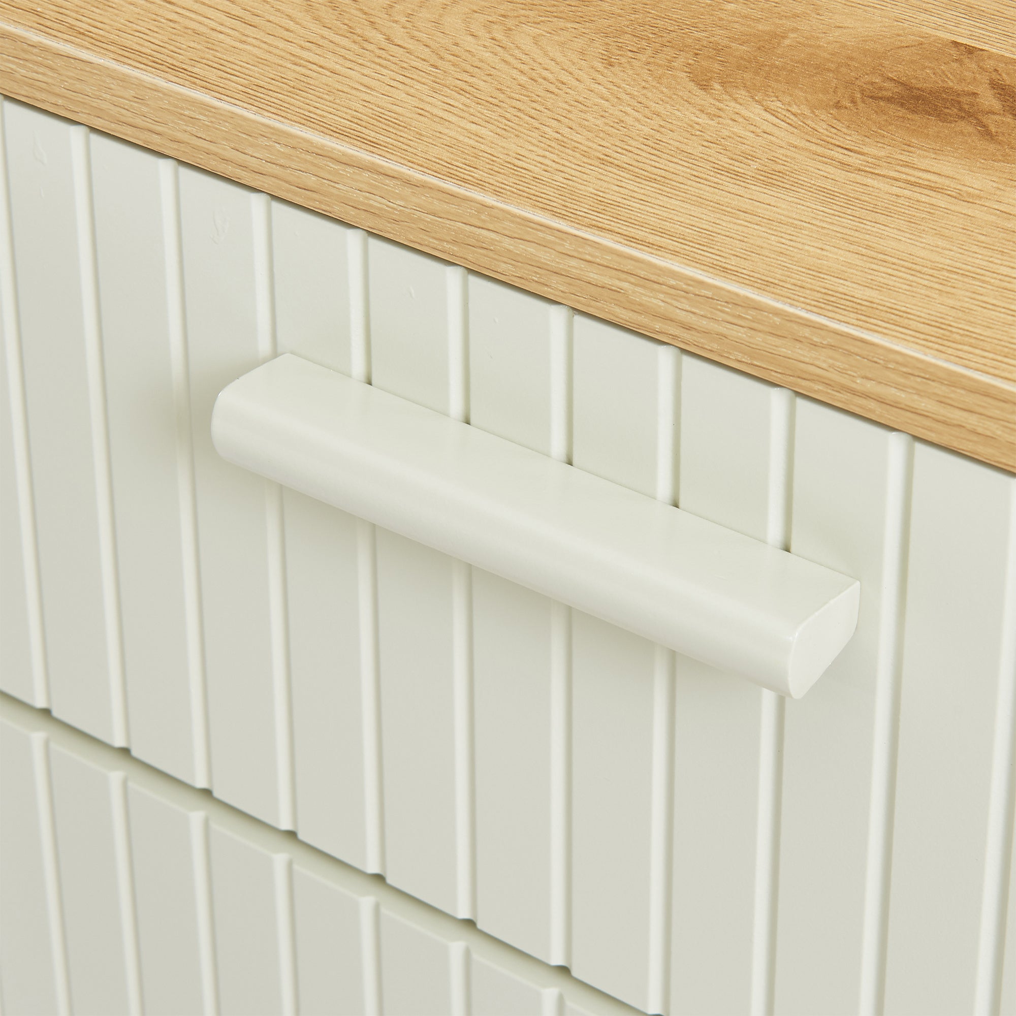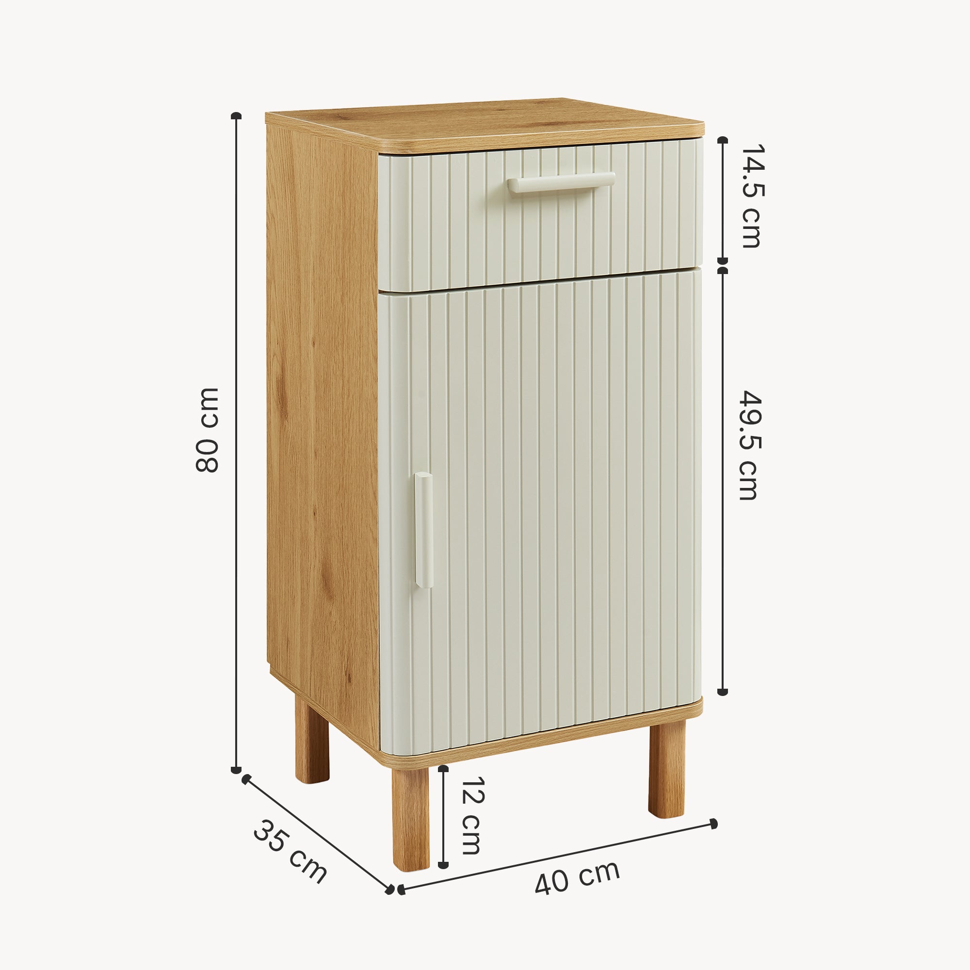 Il mobile dispone di una porta con frontale scanalato. Questo permette di aprirlo e chiuderlo facilmente, garantendo un accesso semplice ai tuoi articoli da bagno. Il cassetto superiore offre un’ulteriore possibilità di conservare vari oggetti come ad esempio cosmetici, accessori per capelli o sapone di riserva.