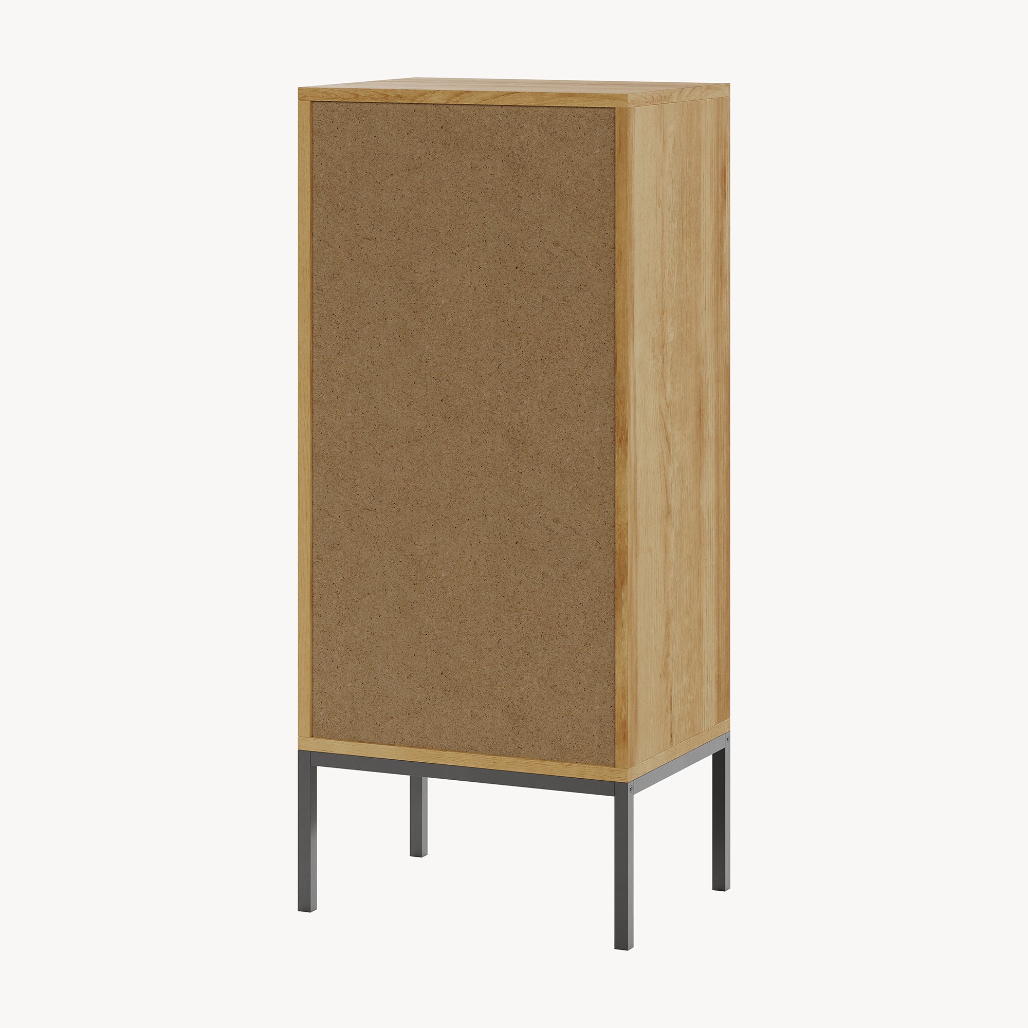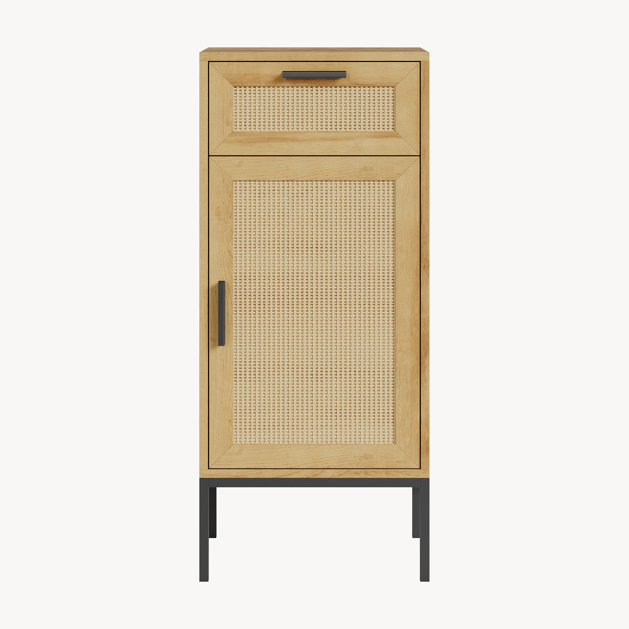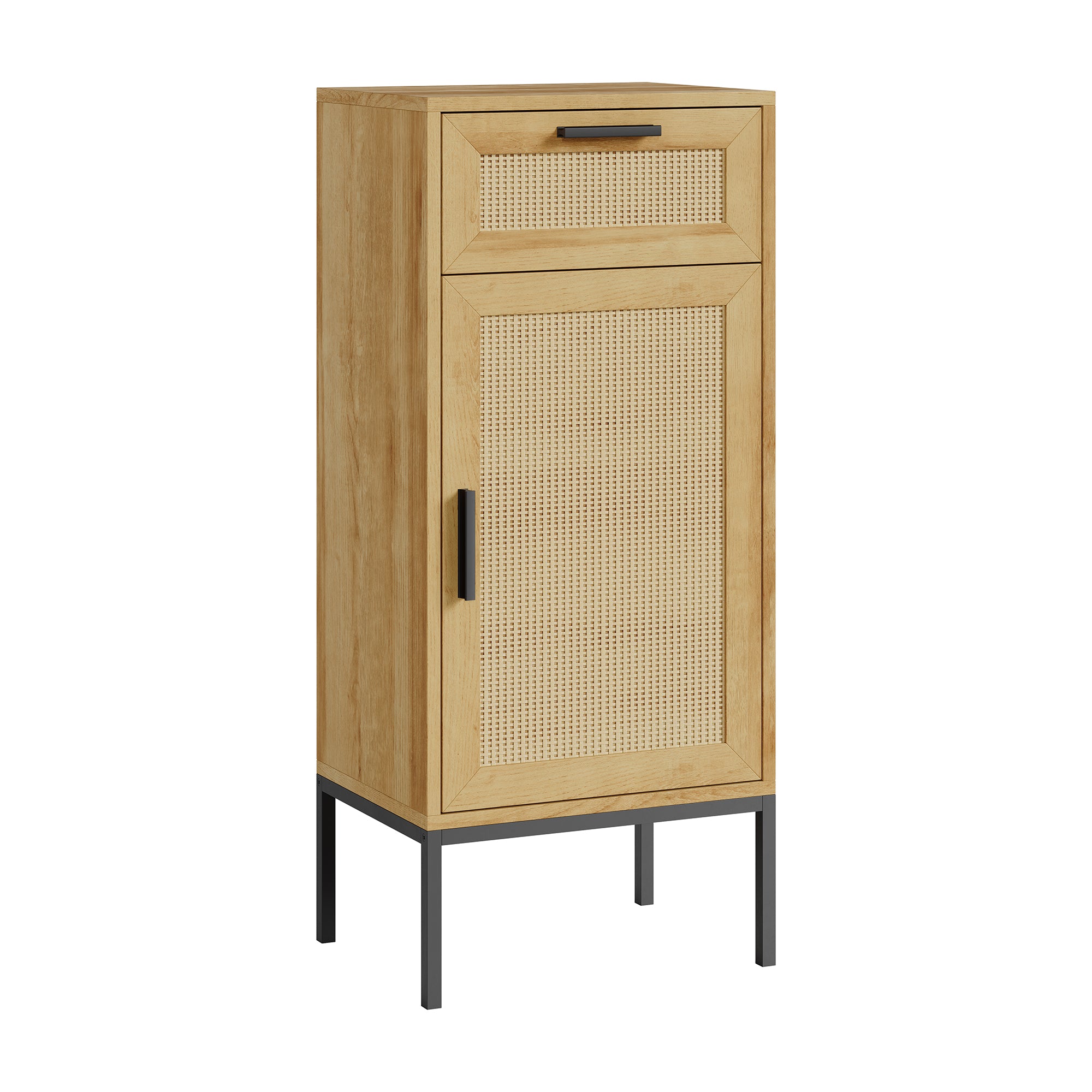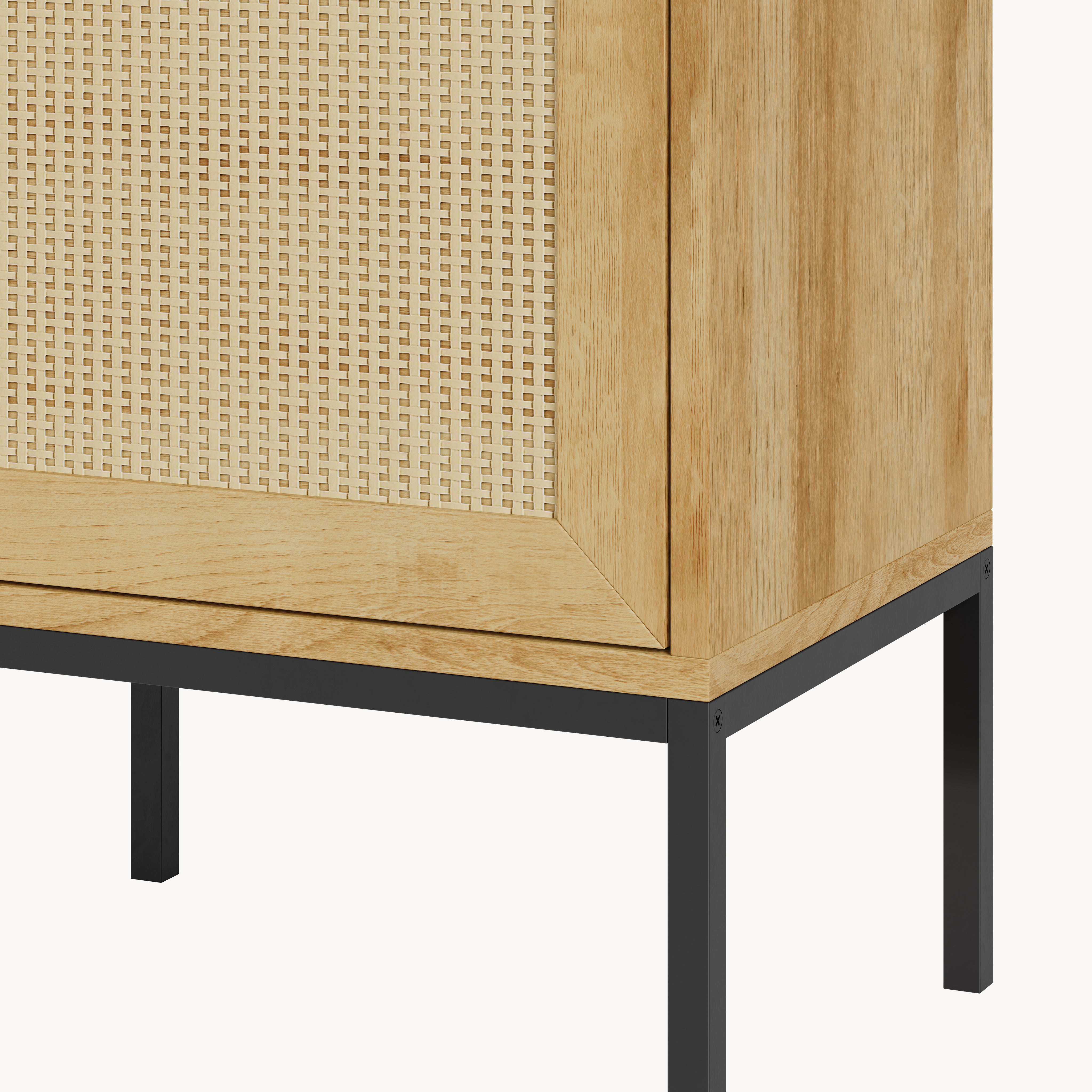 Il corpo del mobile è realizzato in truciolare effetto rovere, che dona calore all’ambiente, mentre i frontali sono impreziositi da un raffinato intreccio in plastica effetto rattan, aggiungendo stile al design. Il telaio in metallo nero crea un elegante contrasto contemporaneo e assicura robustezza e stabilità.