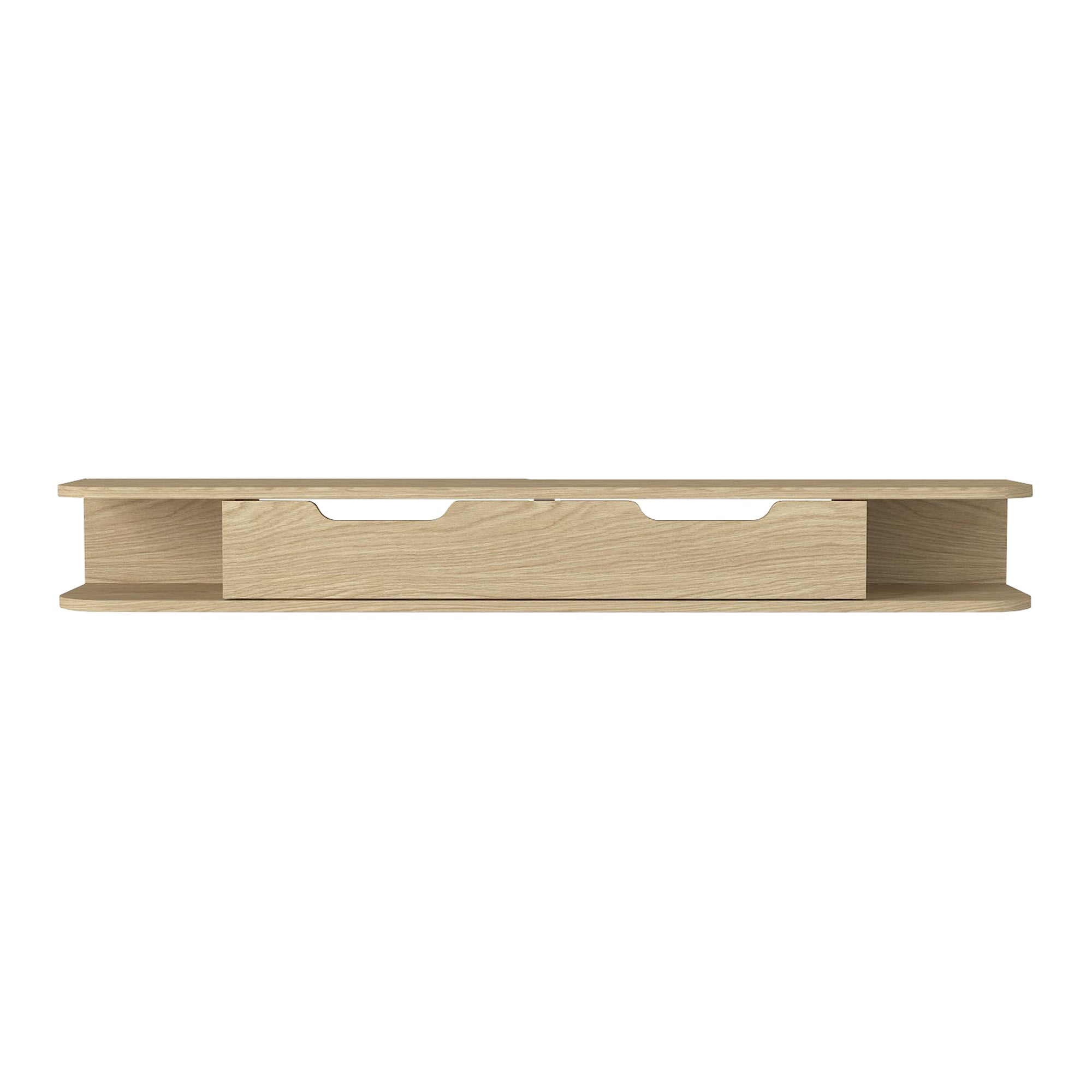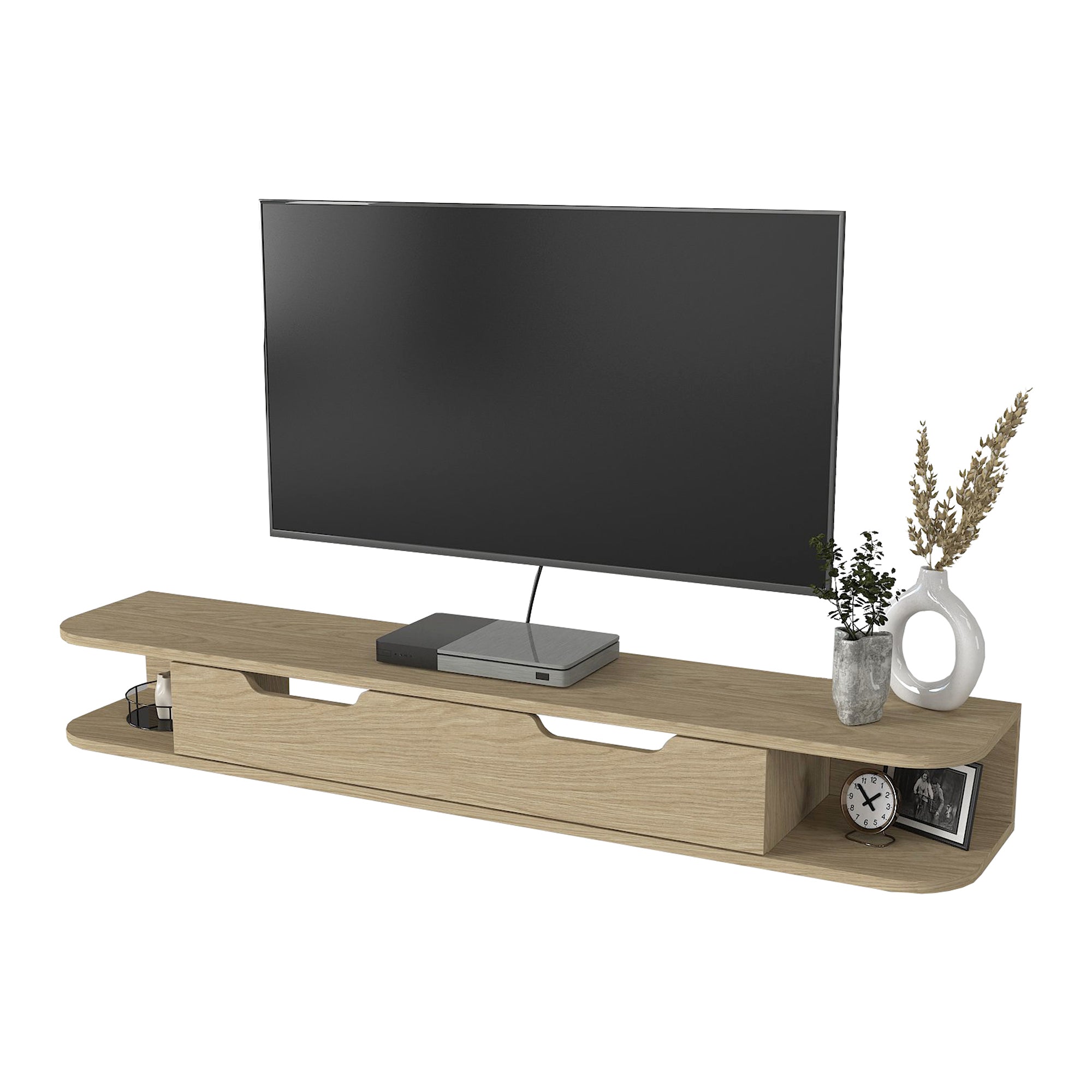La spaziosa superficie superiore offre ampio spazio per il televisore. Sotto si trova un'anta continua con due maniglie incavate, dietro la quale si nasconde un ampio vano interno per dispositivi multimediali come console di gioco, lettore DVD, decoder o box streaming. Inoltre, sono disponibili vani aperti su entrambi i lati per accessori o oggetti decorativi.
