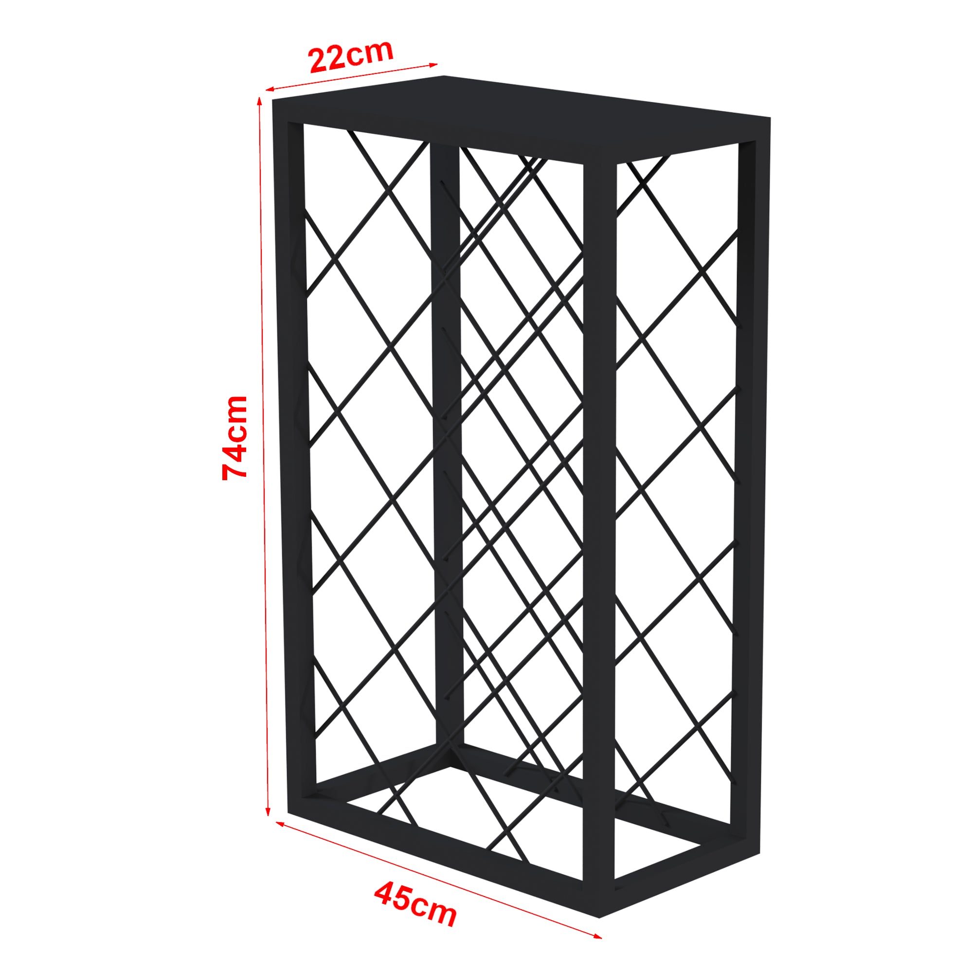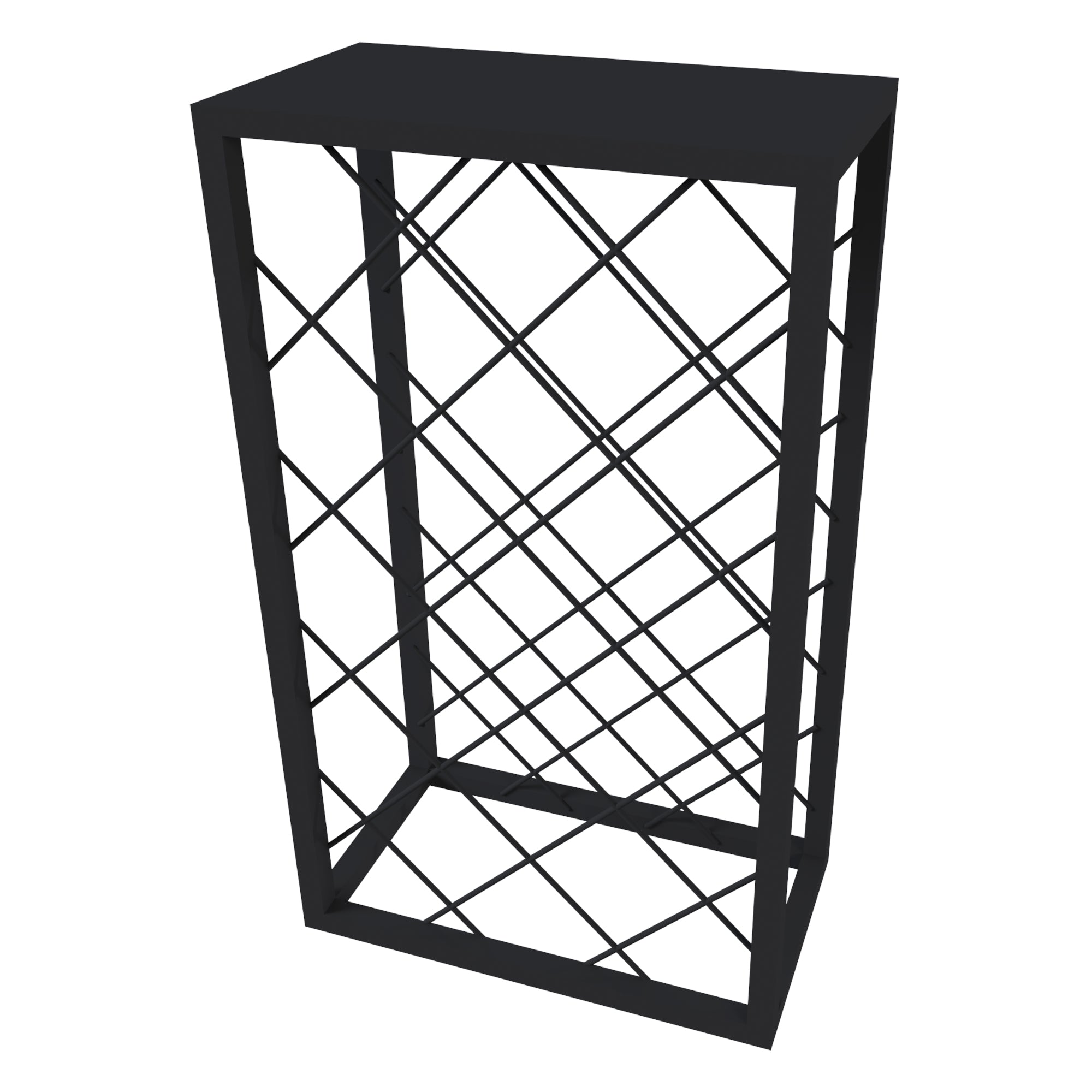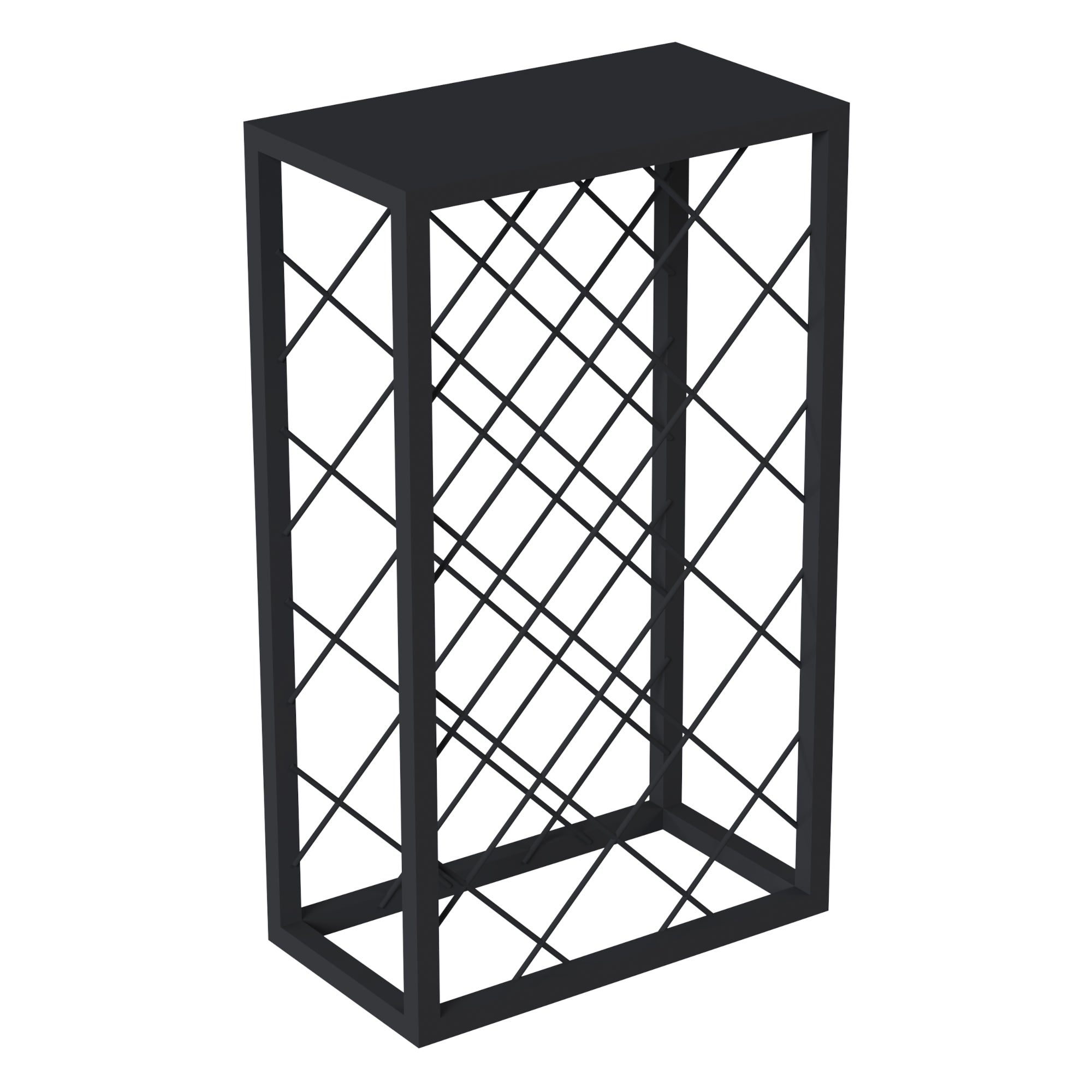 La parte anteriore e posteriore della forma rettangolare presenta una rete romboidale che serve a ospitare le bottiglie di vino in modo inclinato e distanziato, il che contribuisce a preservare il vino nel modo migliore possibile. La disposizione inclinata delle bottiglie non solo è esteticamente piacevole, ma aiuta anche a mantenere il tappo umido, preservando la freschezza del vino. La struttura solida e resistente garantisce stabilità, offrendo un luogo sicuro e organizzato per conservare le tue bottiglie preferite.