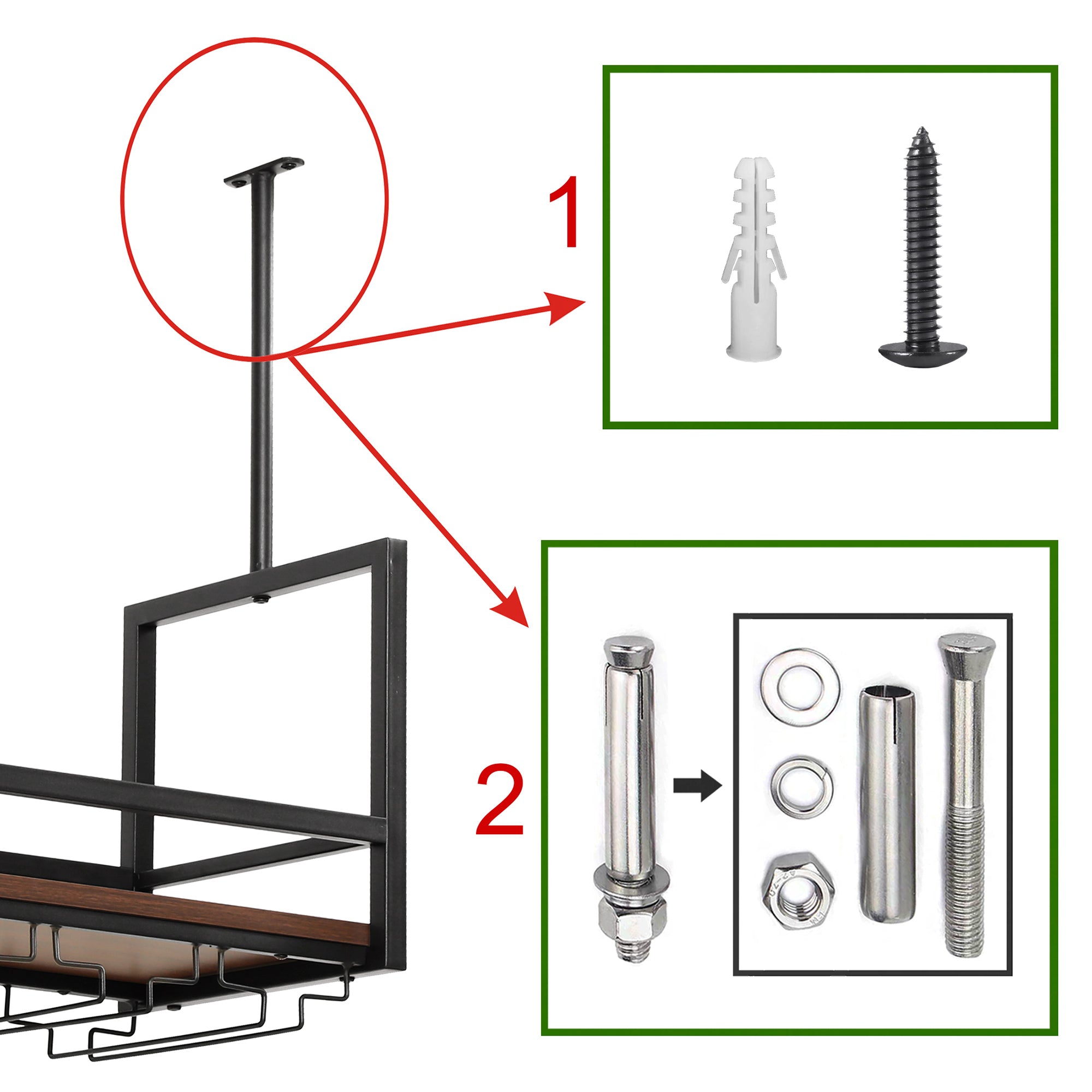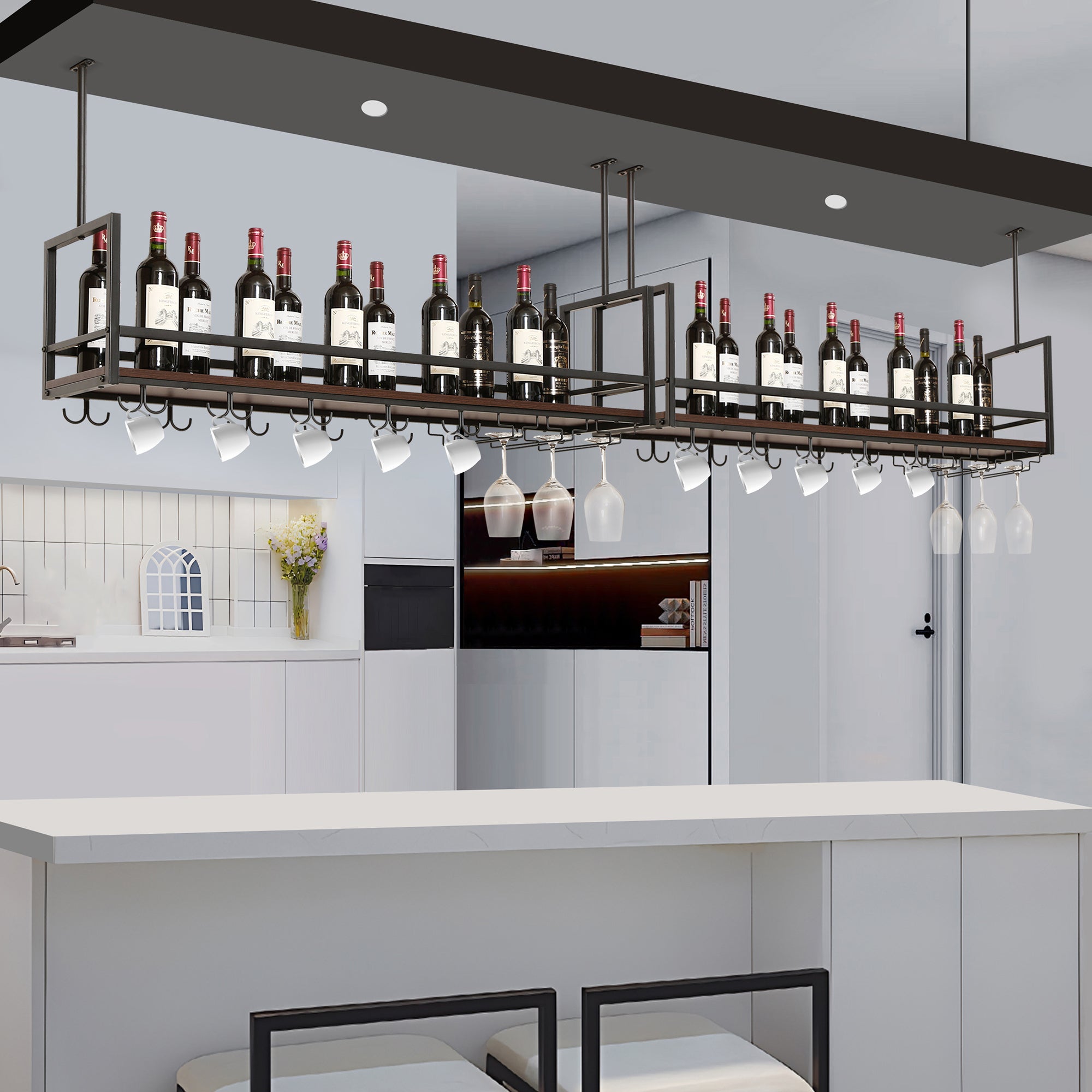 Questo elegante portabottiglie da soffitto coniuga design moderno e funzionalità, diventando un elemento d’arredo pratico e di grande impatto visivo per cucine, zone pranzo o ambienti in stile industriale. La struttura si compone di un solido telaio in metallo verniciato nero, alto 60 cm, pensato per essere fissato direttamente al soffitto tramite il materiale di montaggio incluso. Il telaio sostiene una mensola con finitura effetto noce, incorniciata da una barriera anticaduta che impedisce lo scivolamento delle bottiglie o degli oggetti riposti.