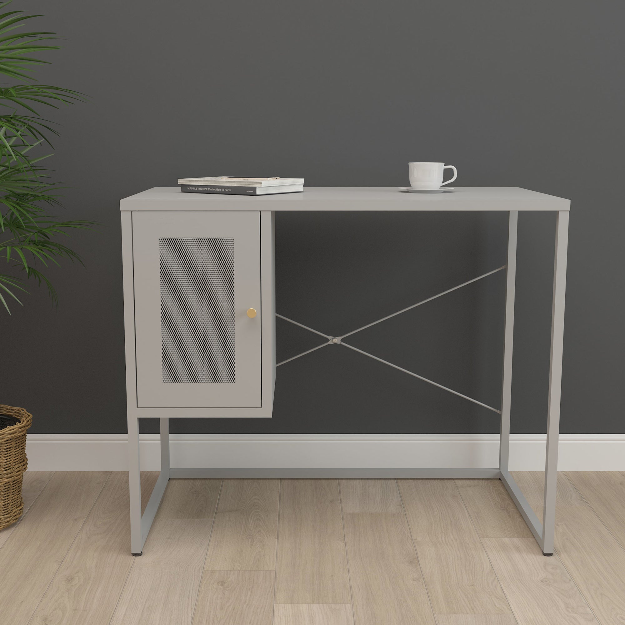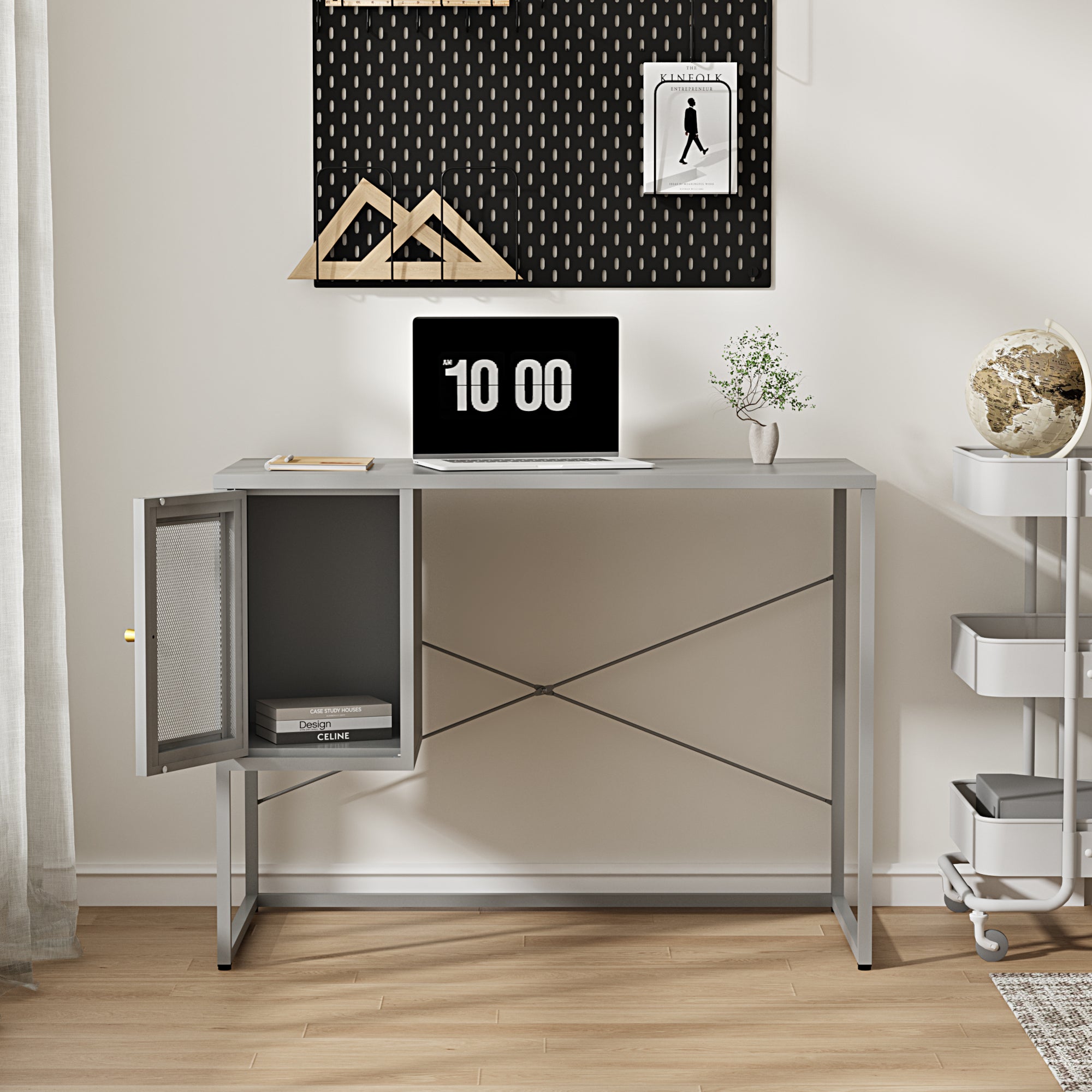 Una caratteristica particolare dello scrittoio è il vano portaoggetti integrato lateralmente. È dotato di una porta a griglia a maglia fine con maniglia e offre un modo pratico per riporre libri e altri oggetti risparmiando spazio.