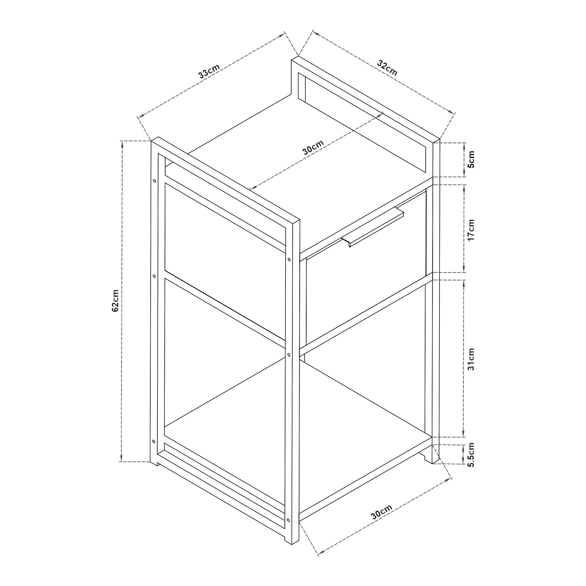 - Totale (AxLxP): 62 x 33 x 32 cm