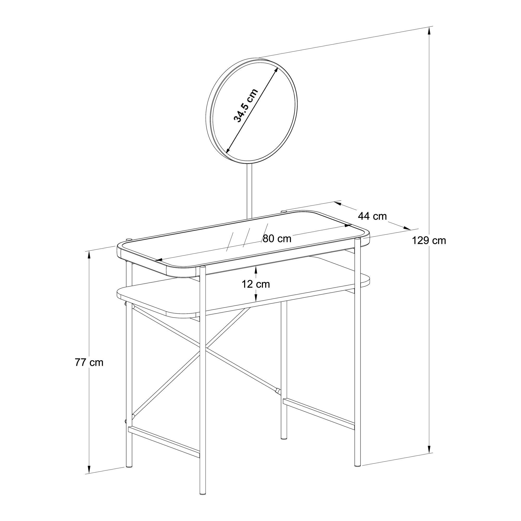 - Distanza tra il ripiano inferiore e il piano del tavolo: 12 cm